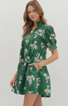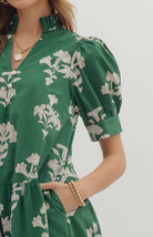 Fresh and feminine, the Shawna Mini Dress features a rich green base with delicate ivory floral prints. Designed with a ruffled collar, button-front detail, and puff sleeves, this easy silhouette flows into a relaxed, tiered skirt. This cotton dress can be worn for daytime outings or dressed-up evenings.
