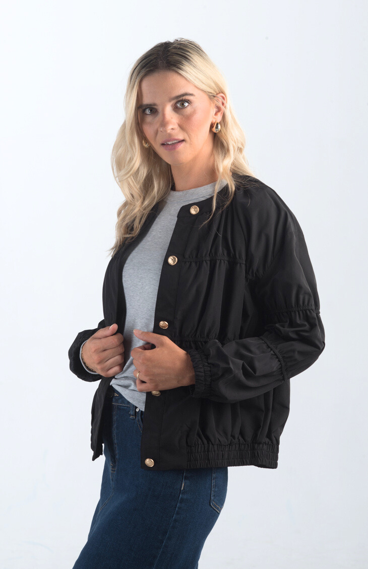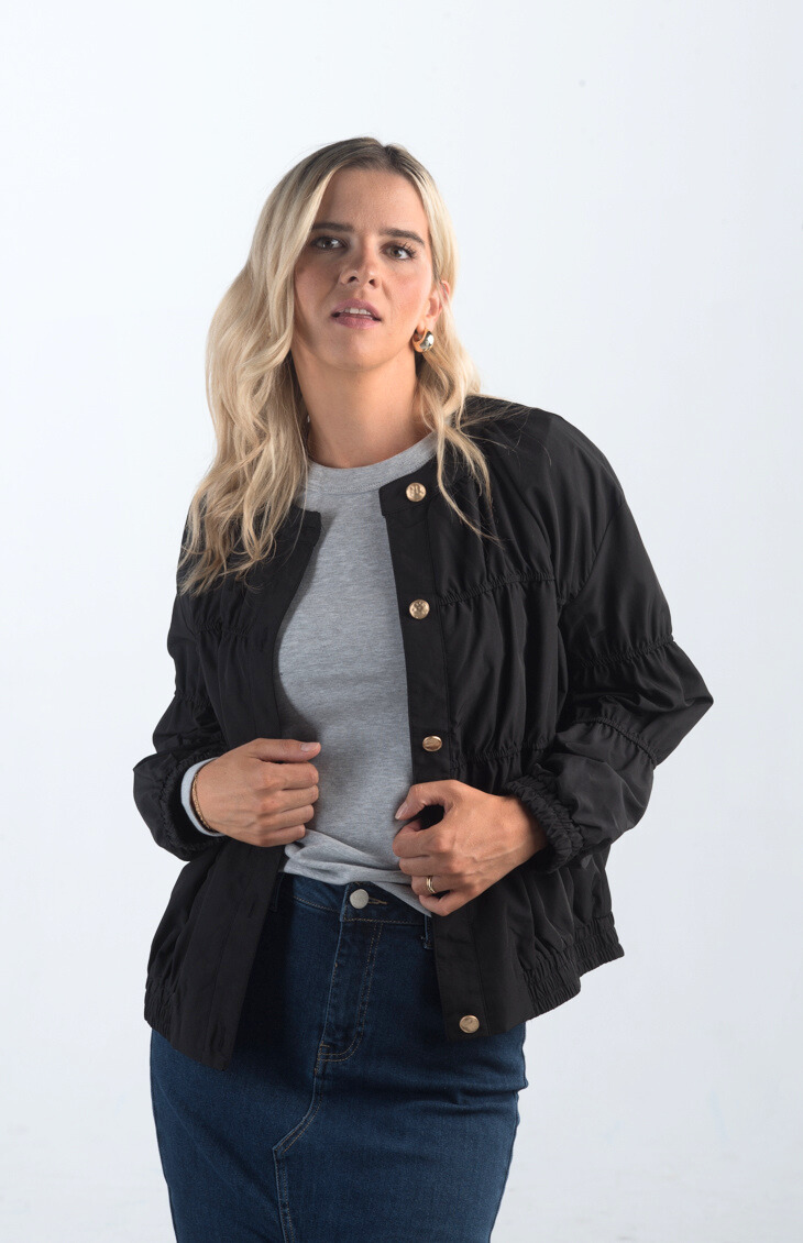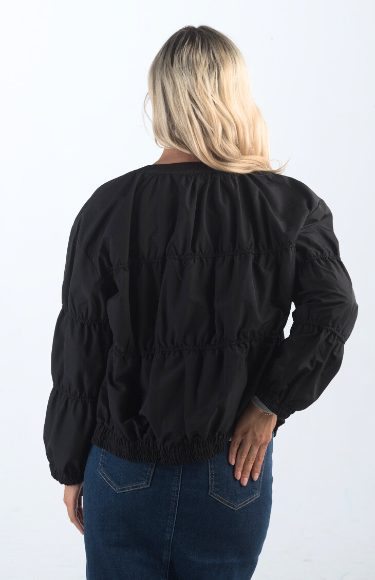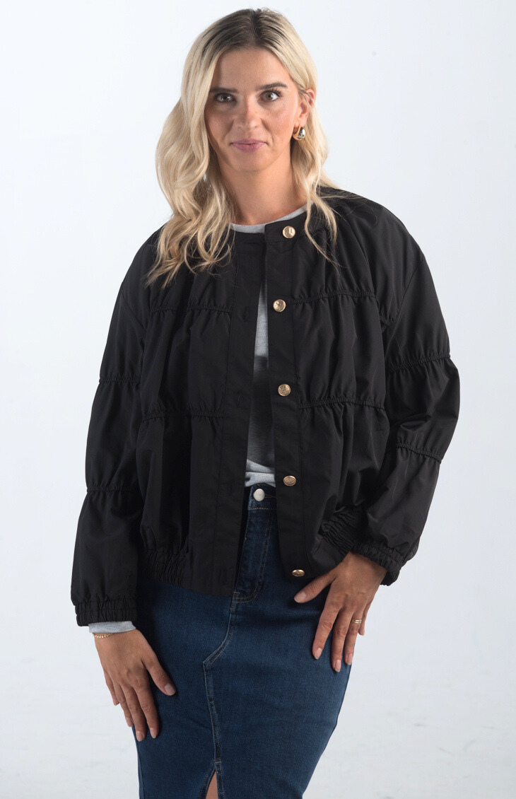 Introducing the Take a Picture Jacket, a jet black light jacket that effortlessly combines style with comfort. Featuring a tiered design with gathered fabric for a slightly puffed look, this jacket offers a chic and relaxed fit. The button-down front with shiny buttons, along with elastic cuffs and hem, makes it perfect for layering on cooler days.