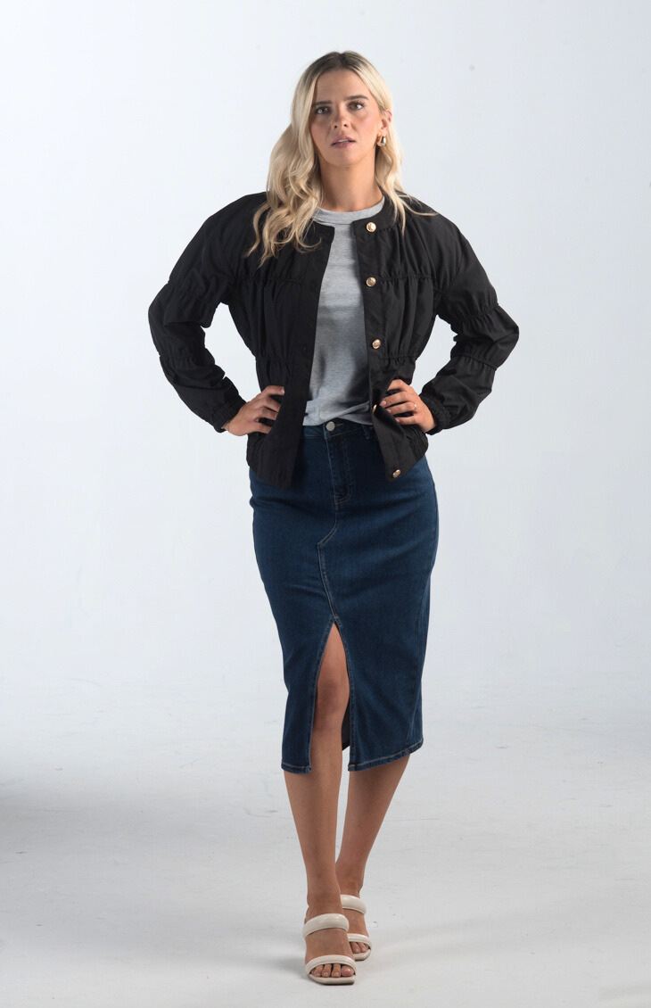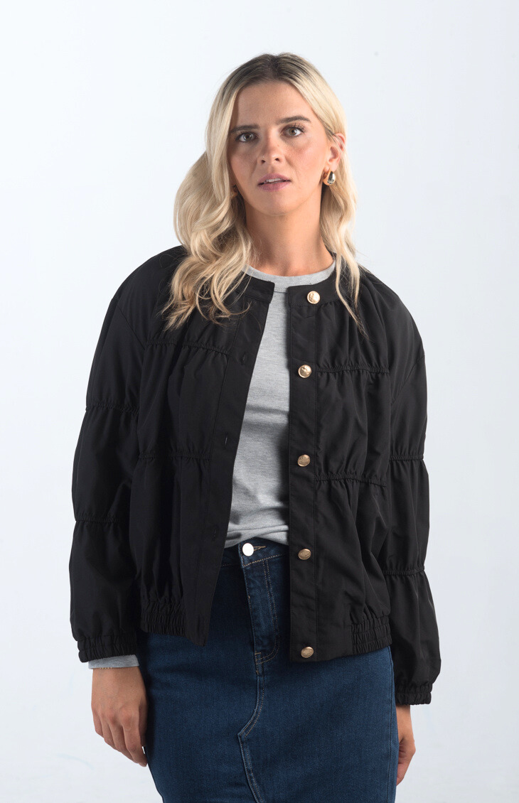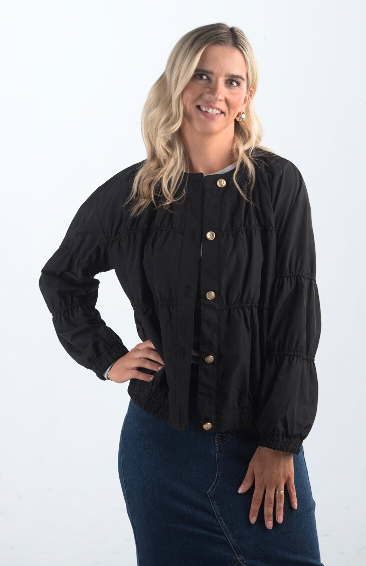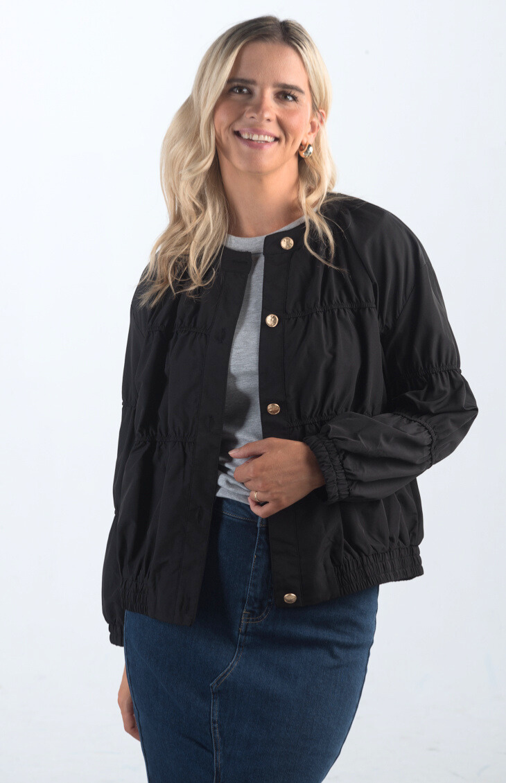 Introducing the Take a Picture Jacket, a jet black light jacket that effortlessly combines style with comfort. Featuring a tiered design with gathered fabric for a slightly puffed look, this jacket offers a chic and relaxed fit. The button-down front with shiny buttons, along with elastic cuffs and hem, makes it perfect for layering on cooler days.