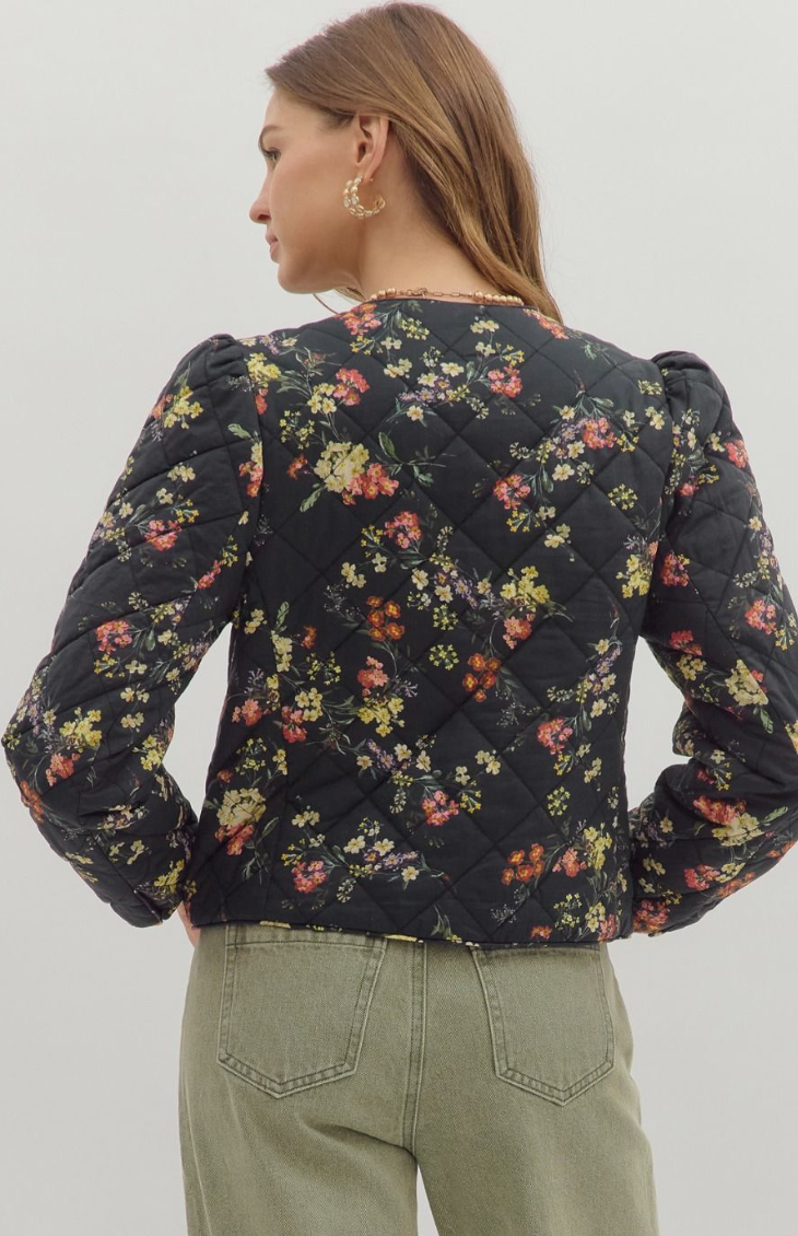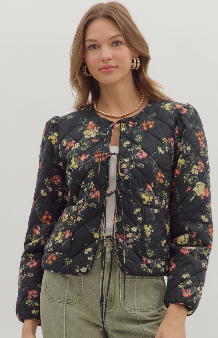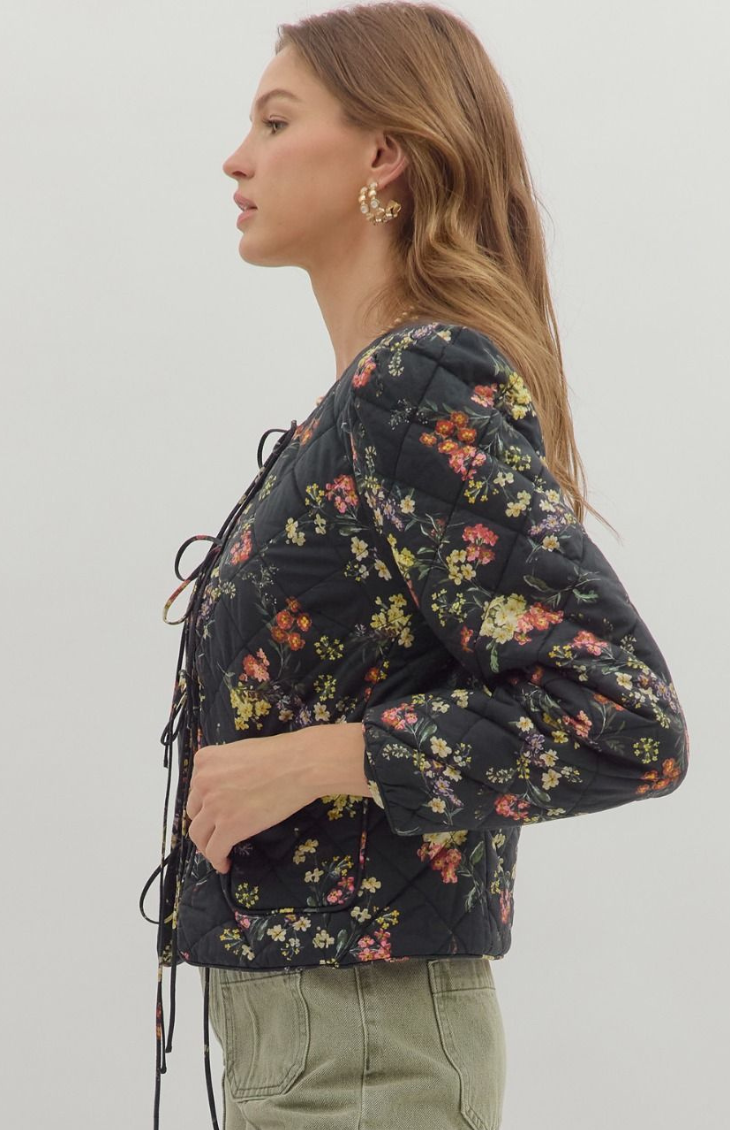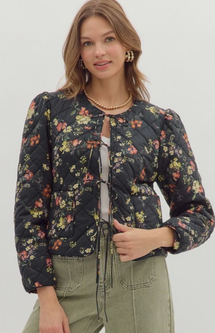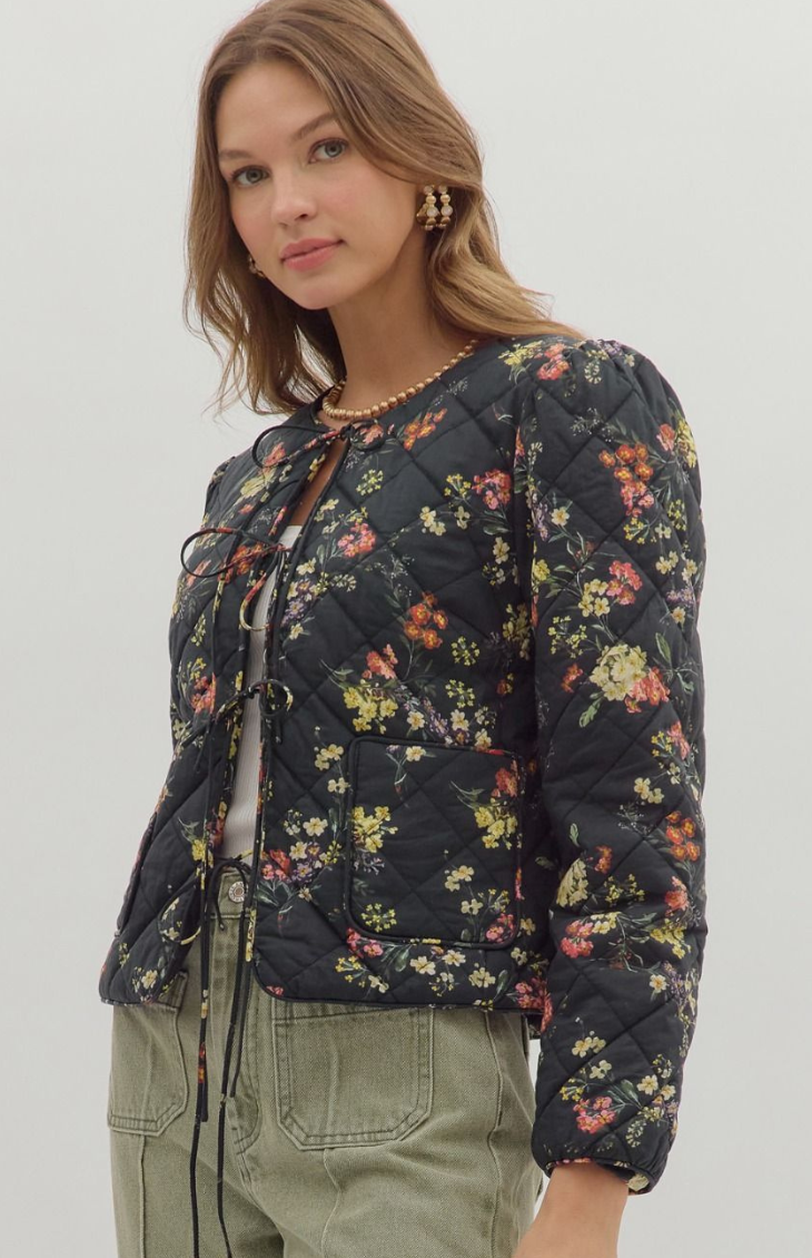 The Williamsburg Quilted Jacket is a charming lightweight cotton outerwear piece to add to your wardrobe for fall and spring seasons layered over a white tee and paired with colored denim bottoms. Its dainty floral pattern and diamond quilted texture are playful and girly; same with the bow-tie closure details at the front.Β