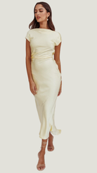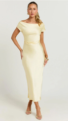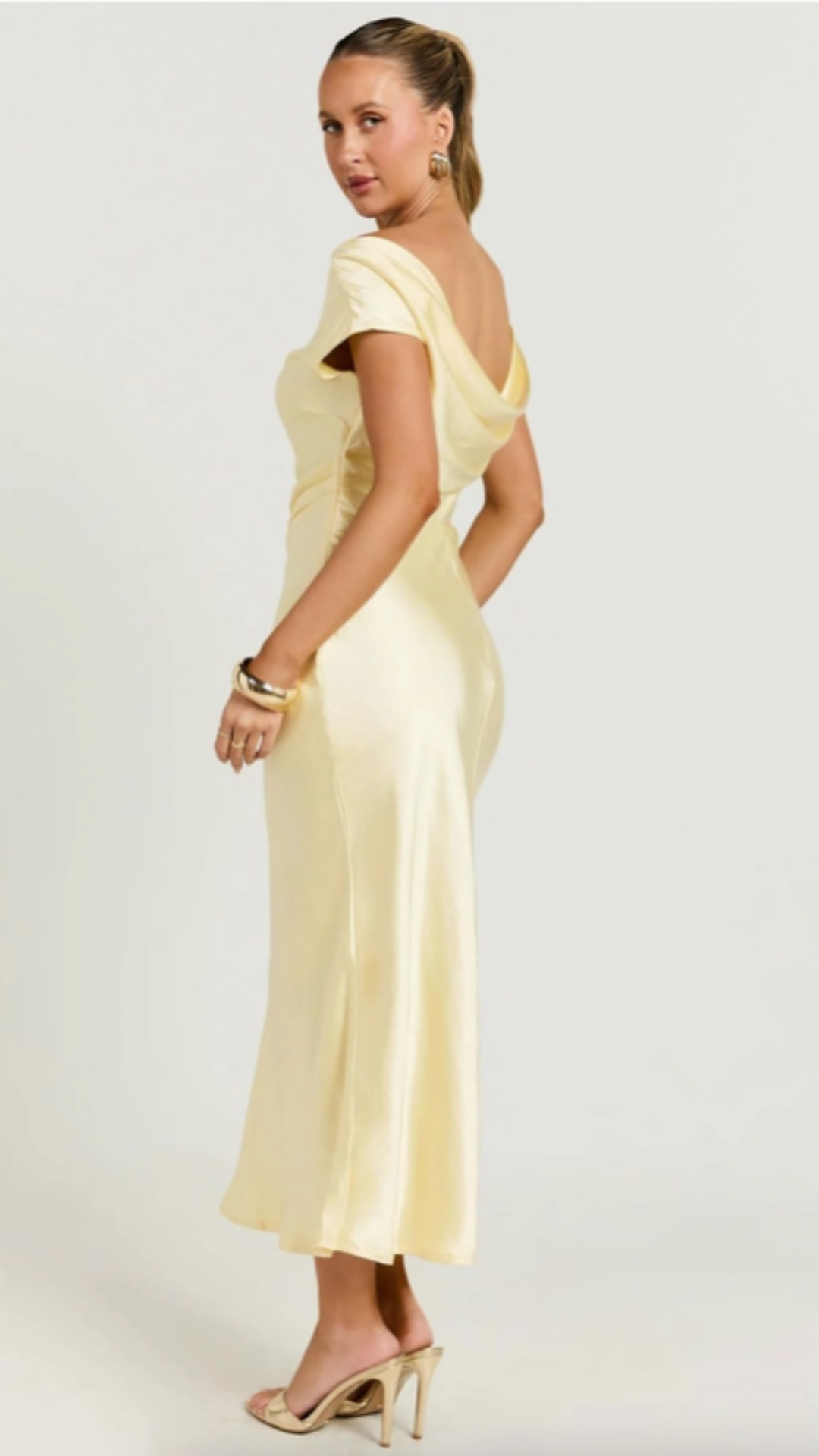 Designed for those love-filled moments and golden celebrations, this dreamy midi dress brings effortless romance to every wedding invite. Drenched in a soft butter-yellow hue, it captures that just-right glow—warm, flattering, and undeniably joyful.