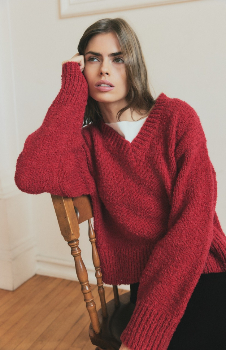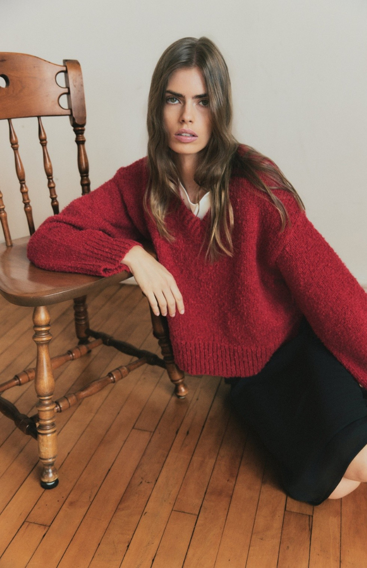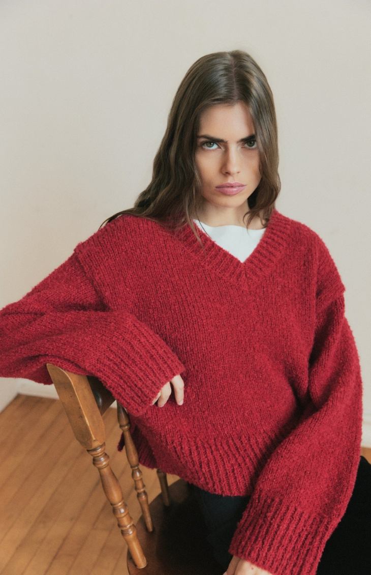 Cozy meets contemporary in the Glen Sweater, crafted from a heavyweight boucle knit for a soft, textured feel. Designed with an oversized silhouette, deep V-neckline, and long sleeves, it drapes effortlessly for a relaxed yet elevated look. Perfect for layering over a simple tee or pairing with wide-leg trousers, this sweater brings comfort and style together in perfect harmony.