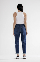 The Gracie High Rise Mom Jogger is by our beloved denim brand Mica, and features a soft, stretchy denim fabric that will shock you with its comfort. This style features large front pockets and a bow tie drawstring that cinches the waist. Its dark-wash color is perfect for fall. Its slightly cuffed bottom is trendy and playful, perfect to pair with your favorite sneakers, loafers, or ballet flats.