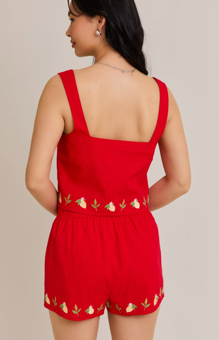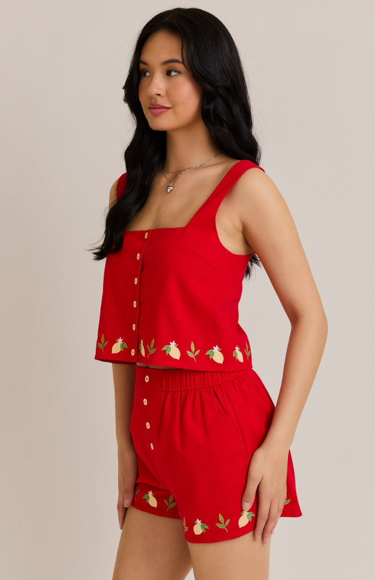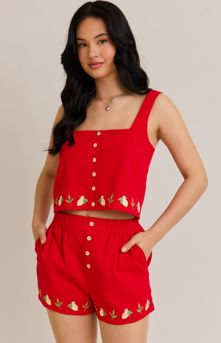 The Samantha Set is a playful outfit for summer featuring its bold red color and lemon icon embroidery at the bottom of both the shorts and top. The white buttons down the front of the top and shorts pop against the red fabric adding another fun element. The top features a square neckline and thick straps. The shorts feature an elastic waistband and pockets for comfort and ease. Wear with your favorite summer sandals and shoulder bag on your next daytime outing or warm-weather trip.