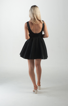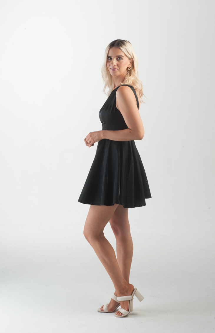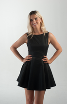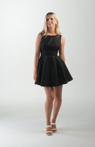 The All Or Nothing Mini Dress in classic black features a sleeveless fit-and-flare design with a fitted bodice and a flared, pleated skirt. Crafted from slightly textured fabric with a subtle sheen, this mini dress exudes elegance. The high, round neckline adds a sophisticated finish, making it perfect for chic occasions.