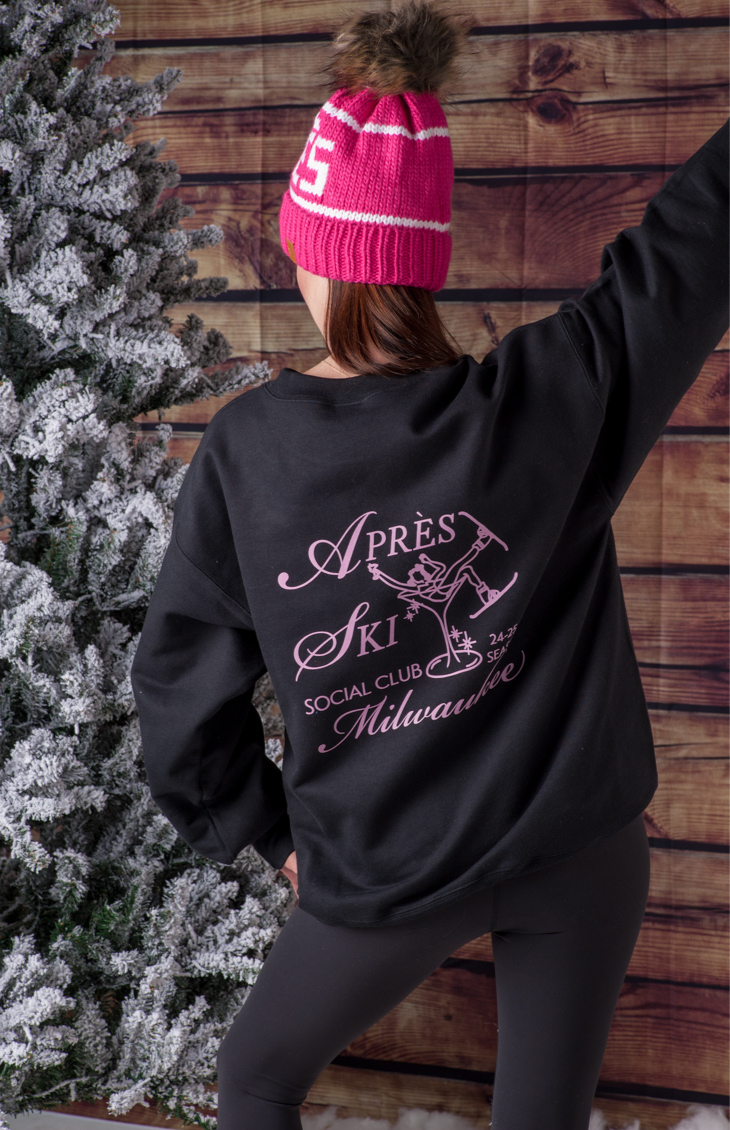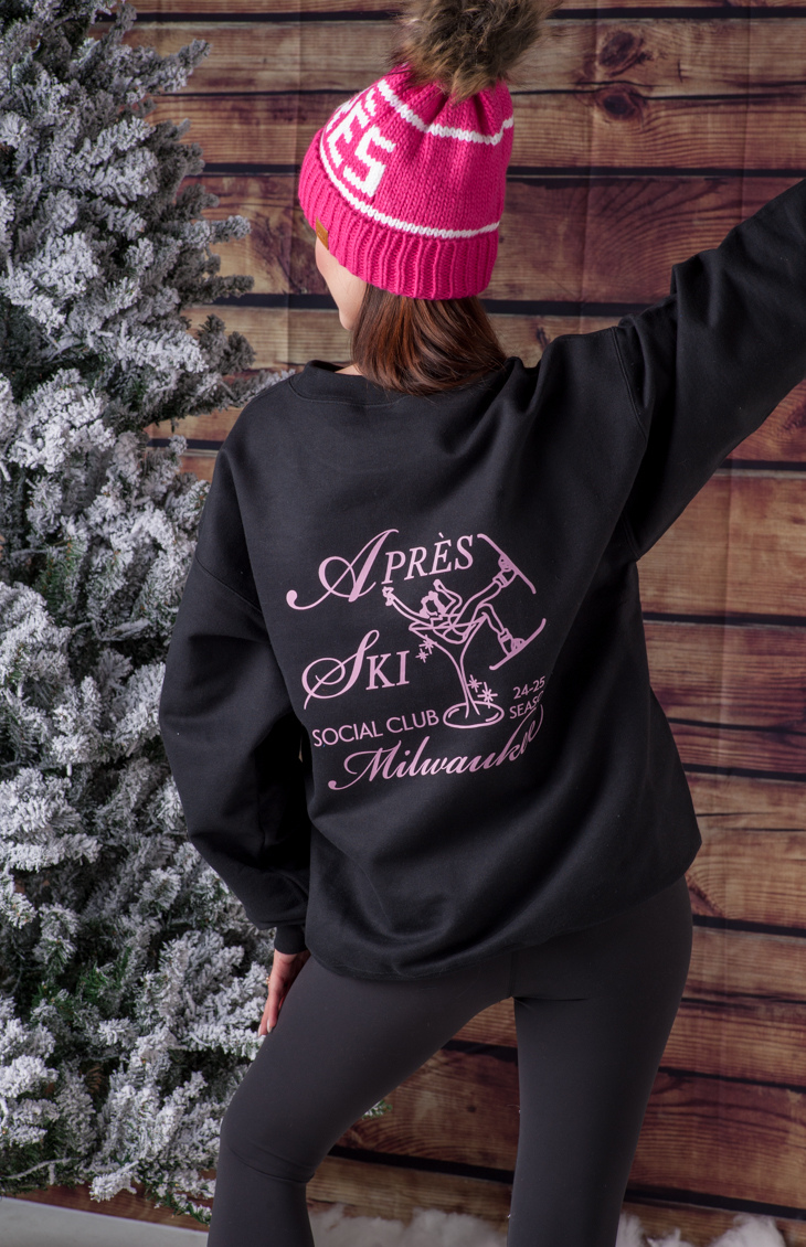 Celebrate Milwaukee’s après-ski scene with this exclusive crewneck! Featuring a playful martini girl graphic and "Après Ski Social Club – Milwaukee" in pink, it’s perfect for winter gatherings, cozy days, and showing off your local pride.
