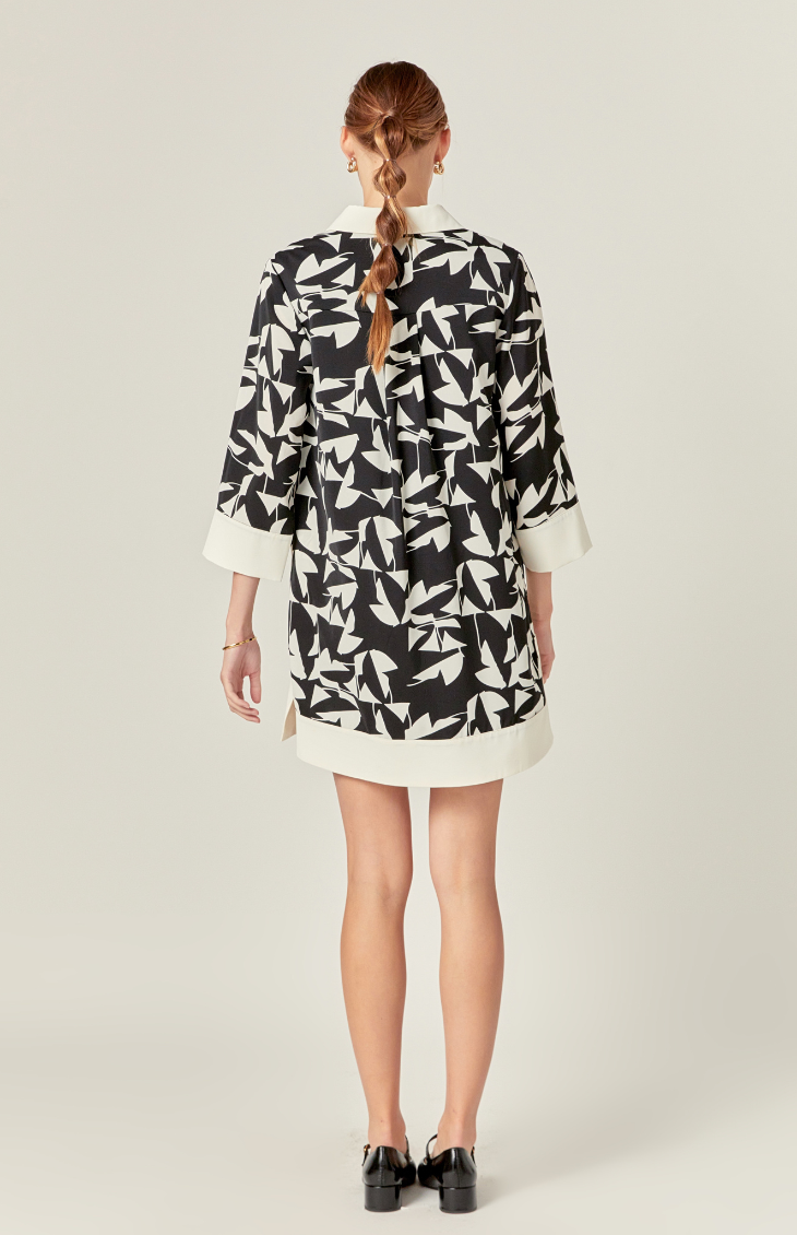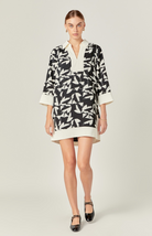 Bold and classy, the April Tunic Dress features a striking abstract print with contrast collar and cuffs for a polished touch. The relaxed silhouette and deep V-neckline create a chic, effortless look perfect for any vacation look day or night.