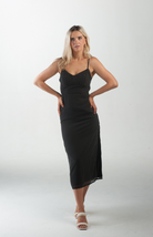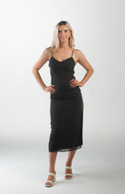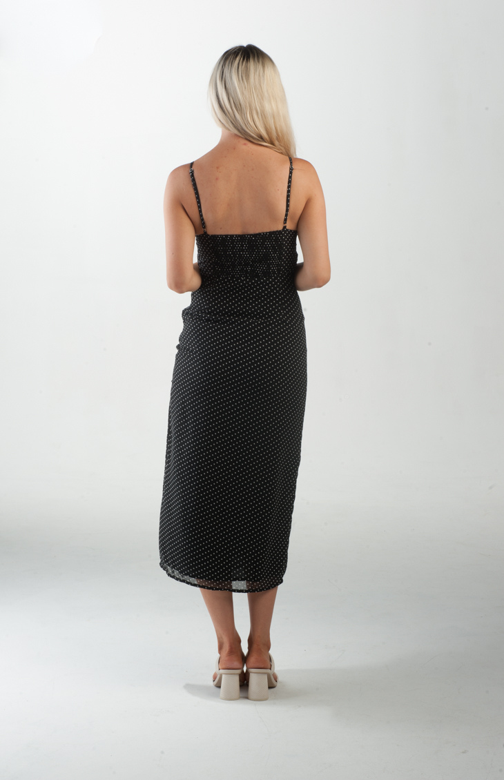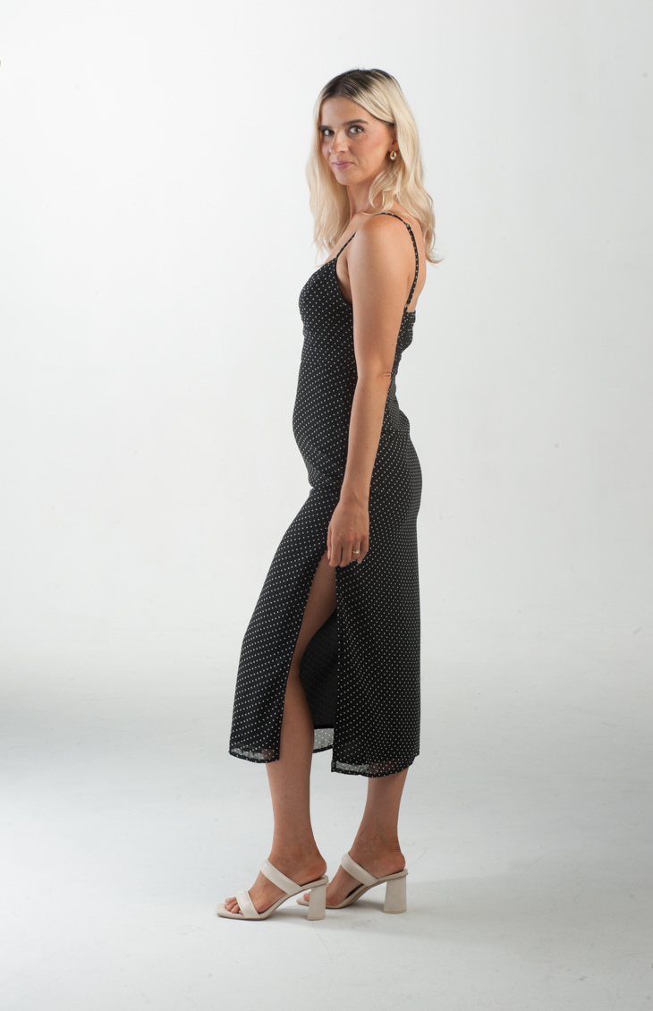 Introducing the Augusta Polka Dot Midi Dress, a black midi dress adorned with classic white polka dots. This spaghetti strap dress features a sweetheart neckline for a feminine touch and a slim, body-skimming fit. A side slit adds both movement and style, making it perfect for casual or semi-formal occasions. Crafted from lightweight, breathable fabric, itโs ideal for warm weather outings.