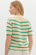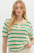 The Bethesda Top features a breezy open-knit textured cotton fabric with cheerful green and cream stripes. This short-sleeve polo silhouette is accented by a classic collar, four-button placket, and scalloped trim at the sleeves and hem for added charm. Lightweight and breathable, it’s the perfect blend of casual and cool—ideal for pairing with shorts, relaxed trousers, or denim for a playful, retro-chic look.