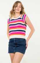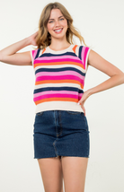 Brighten up your wardrobe with the Coastal Knit Top, featuring a playful mix of bold stripes in a lightweight knit. With cap sleeves and a relaxed fit, this top is perfect for layering or wearing on its own for a vibrant, carefree look.