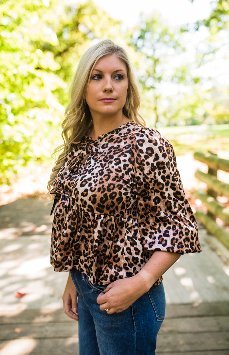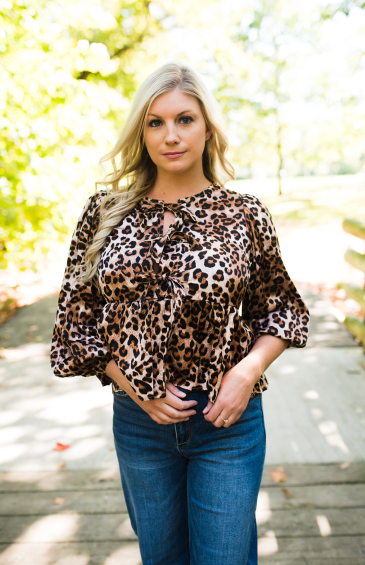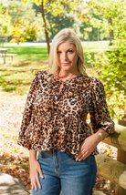 The Concord Top features a bold leopard print for a chic look. Made from soft, velvety fabric with a slight sheen, it adds a touch of luxury. The tie-front neckline with bow details allows for an adjustable fit, while the flowy, relaxed fit and empire waistline create a flattering silhouette. Three-quarter length sleeves with subtle puff detail enhance the volume, and the peplum-style hem adds a playful finish. Perfect for pairing with jeans for a casual look or dressing up with tailored pants for a night out.