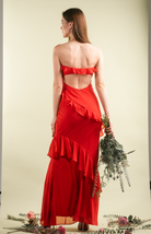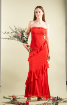 Make a bold statement with the Crimson Orchid Maxi Dress. Its vibrant hue and cascading ruffle details ensure you stand out, whether you're attending a gala or celebrating a special occasion. The open-back design adds a touch of allure, making it the ultimate eveningwear choice.