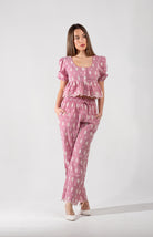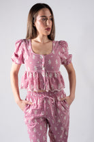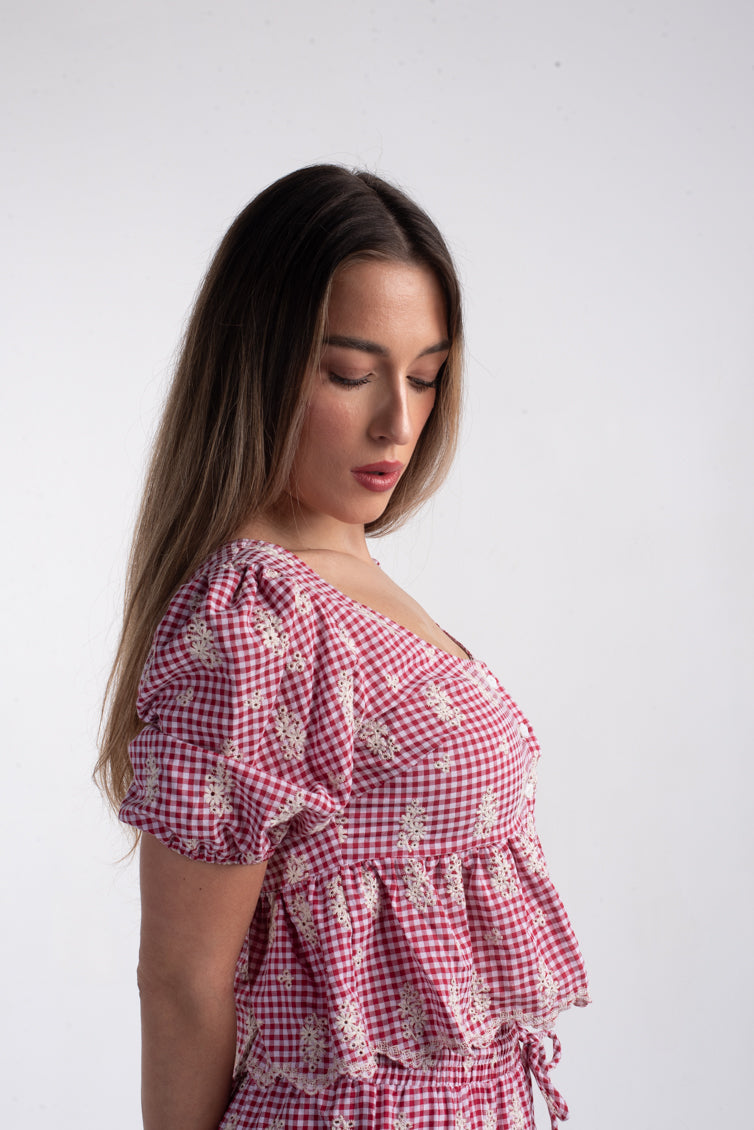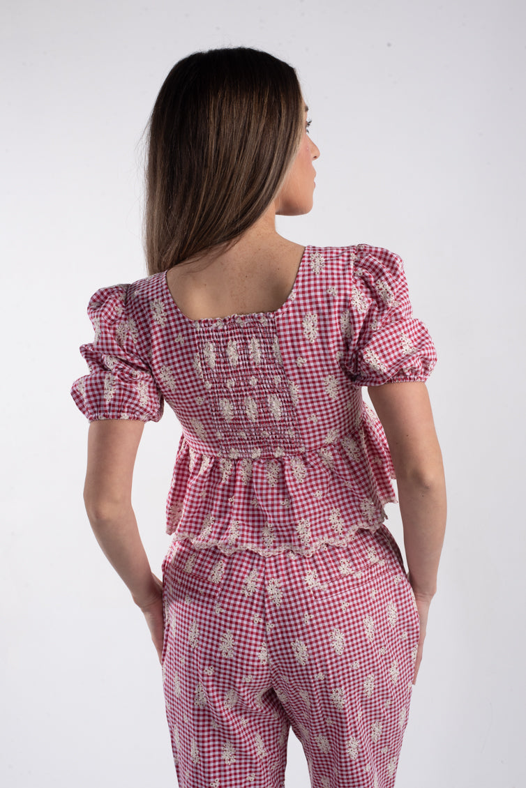 The charming Desert Glow Gingham Scalloped Top blends rustic elegance with vintage appeal. Featuring a soft red-and-white plaid pattern adorned with delicate floral embroidery, it exudes a countryside-inspired aesthetic. The cutesy scalloped peplum and puff sleeves add a feminine touch. Style it with denim, linen, or the matching paints for a casual, yet elevated outfit. Perfect for warm-weather concerts, brunches and more!