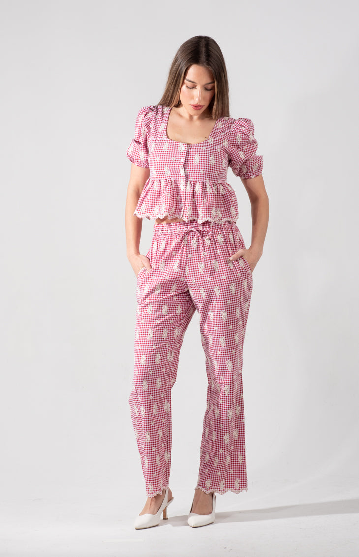 With breezy linen pants, nostalgic gingham prints, and delicate eyelet details all being popular spring styles, the Desert Glow Pants offer a unique blend of these trending elements. With their lightweight fabric and drawstring waist, these comfortable yet ultra-stylish pants will be a piece you are always reaching for. Perfect for relaxed weekends, cozy lounging, or styling with a tucked-in blouse for a cottagecore-inspired look.