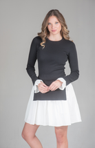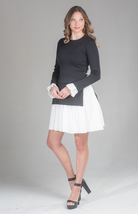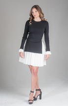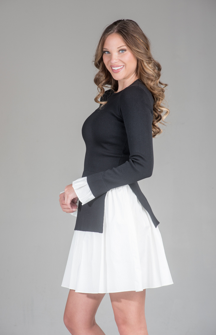 Effortlessly elegant, the Ember Chic Mini Dress combines a tailored knit bodice with a crisp contrast skirt and cuff details. The perfect piece to transition seamlessly from daytime events to evening gatherings, this dress is a statement in refined style.