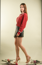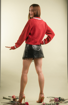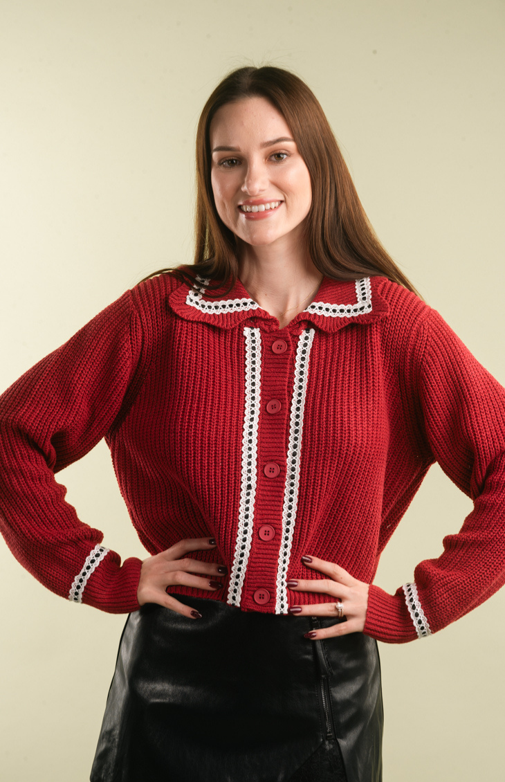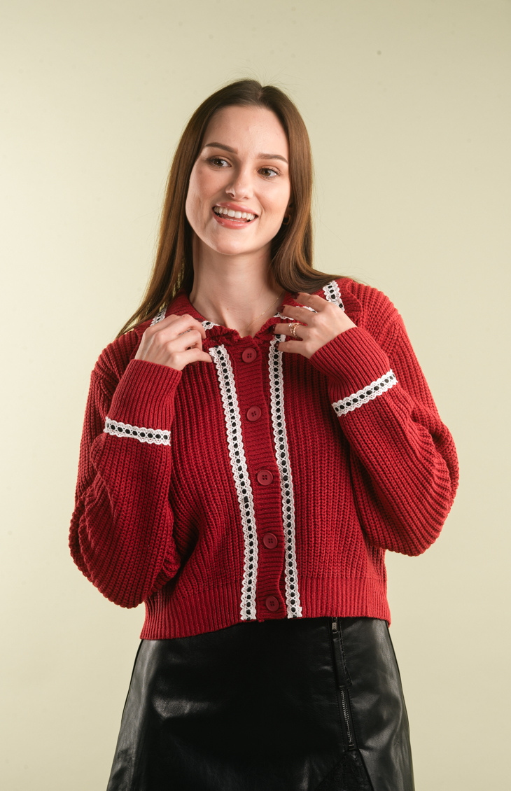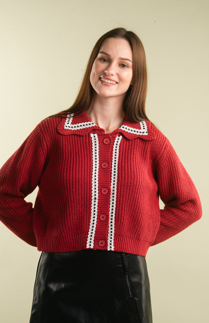 Elevate your layering game with the Ember Drift Sweater, featuring intricate lace accents along the button placket and collar. The rich red hue and ribbed texture add a bold statement to any outfit, making it a must-have for the season.