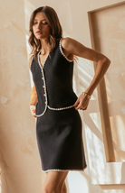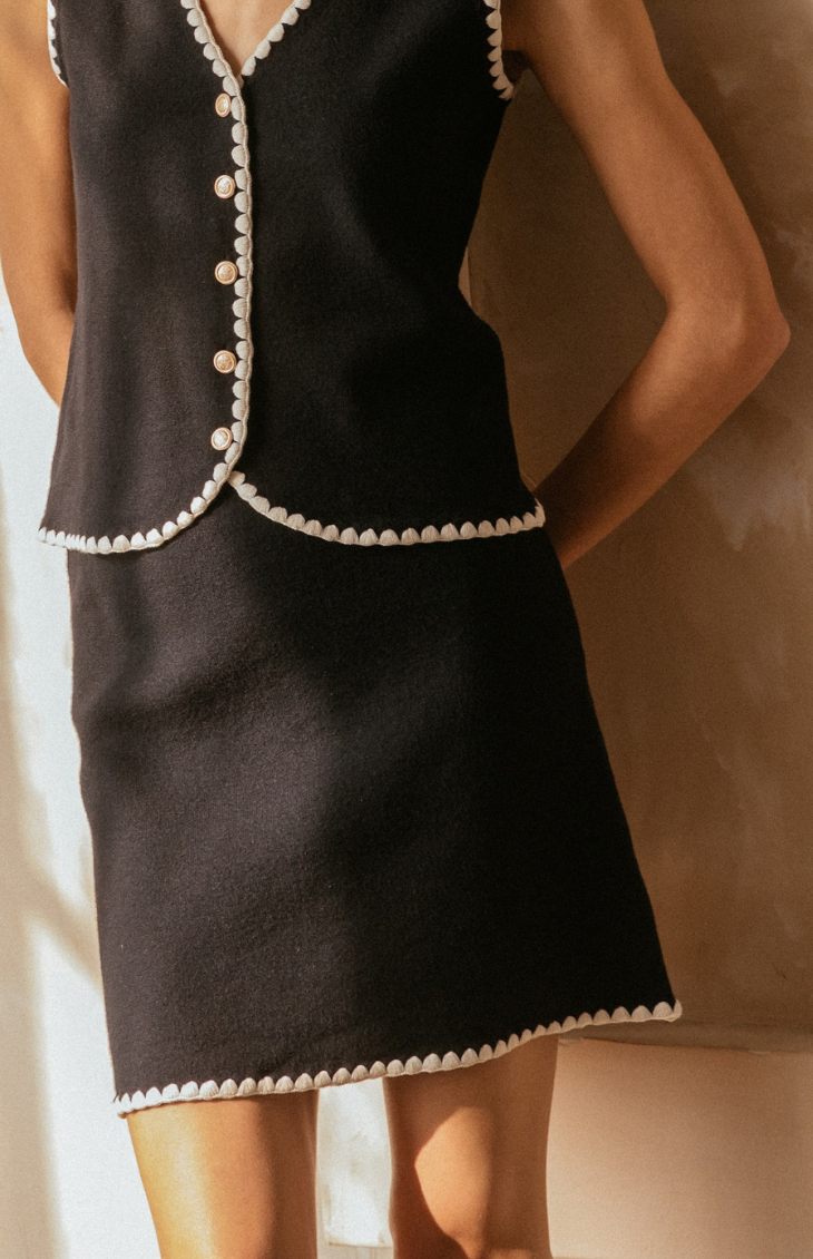 Look classy and chic in the Erika Sweater Mini Skirt. The perfect piece for transitional weather, this skirt features a soft, sweater-like fabric and white scalloped embroidery around the bottom. Pair with the matching Sami Sweater Vest also available at Pink Moon Bay for a modern yet timeless look.