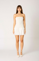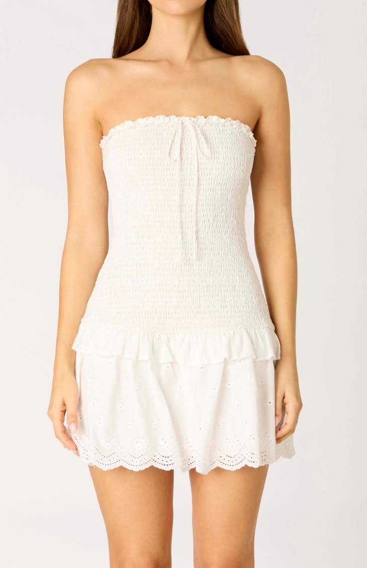 The Fact or Fiction Mini Dress is the perfect girly little white dress for summer featuring its tube top neckline with the bow tie and ruffle detailing, the smocked, drop waist bodice, and the ruffled mini skirt with eyelet lace. Form fitting at the top and frilly at the bottom, its the perfect flattering balance. The cotton dress is lined for extra comfort. Dress down with a denim jacket and sneakers or dress up with heels.Β