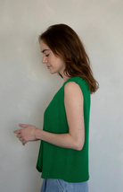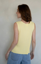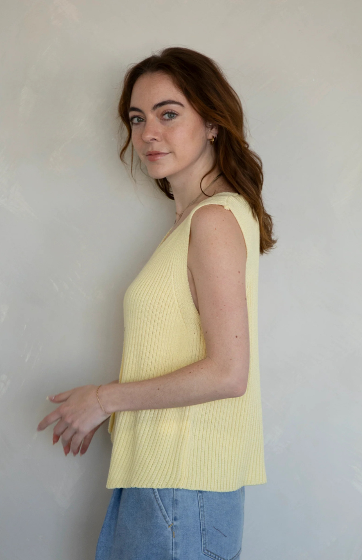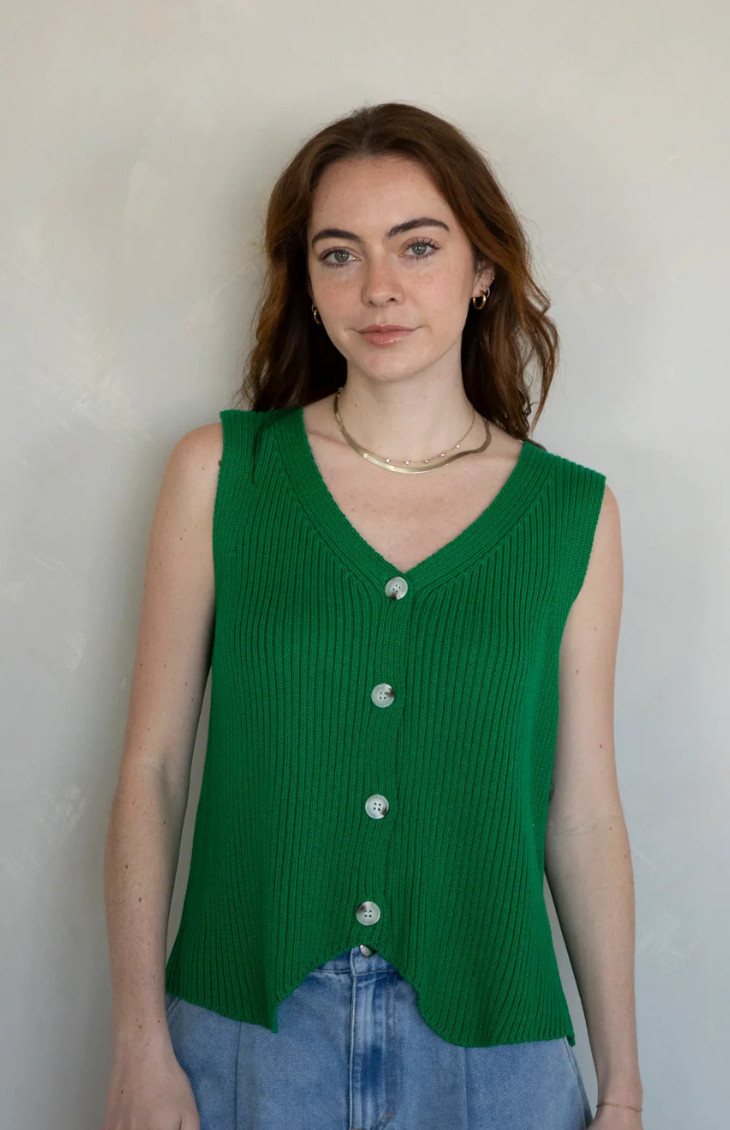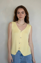 The Frankie Button Down Vest is the perfect piece to wear solo during summer or to layer during transitional seasons with its knit fabric, v-neckline, and sleeveless silhouette. It has a relaxed shape and a button down front for a playful yet put-together look. Pair with your favorite denim and wear alone or have a white tee underneath.