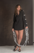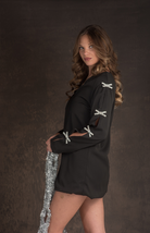 Step into the spotlight with the Frosted Petals Mini Dress. This chic black dress features dazzling rhinestone bow details along the sleeves, adding a touch of sparkle to your holiday look. Perfect for a night of festive fun or a glamorous evening out.