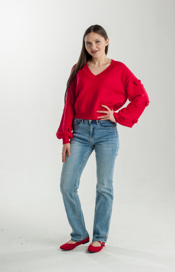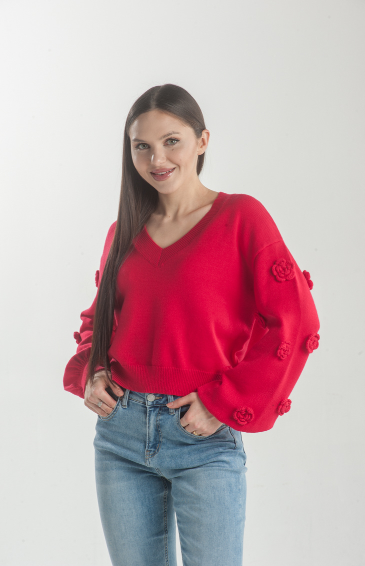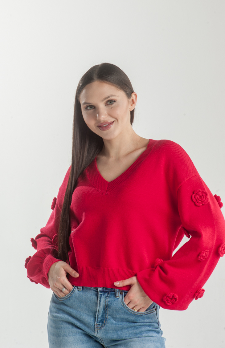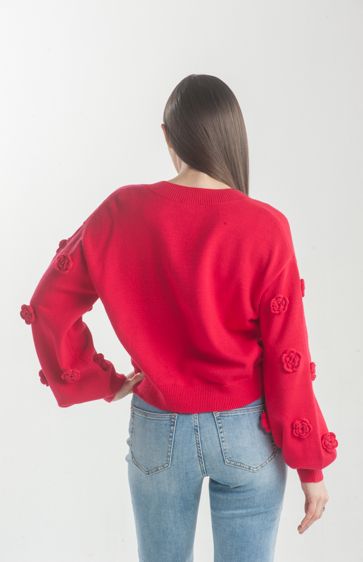 Add a playful touch to your wardrobe with the Frosty Fairy Knit Top. Featuring delicate floral appliqués on the sleeves and a flattering V-neckline, this vibrant piece is perfect for cozy days with a hint of whimsy.