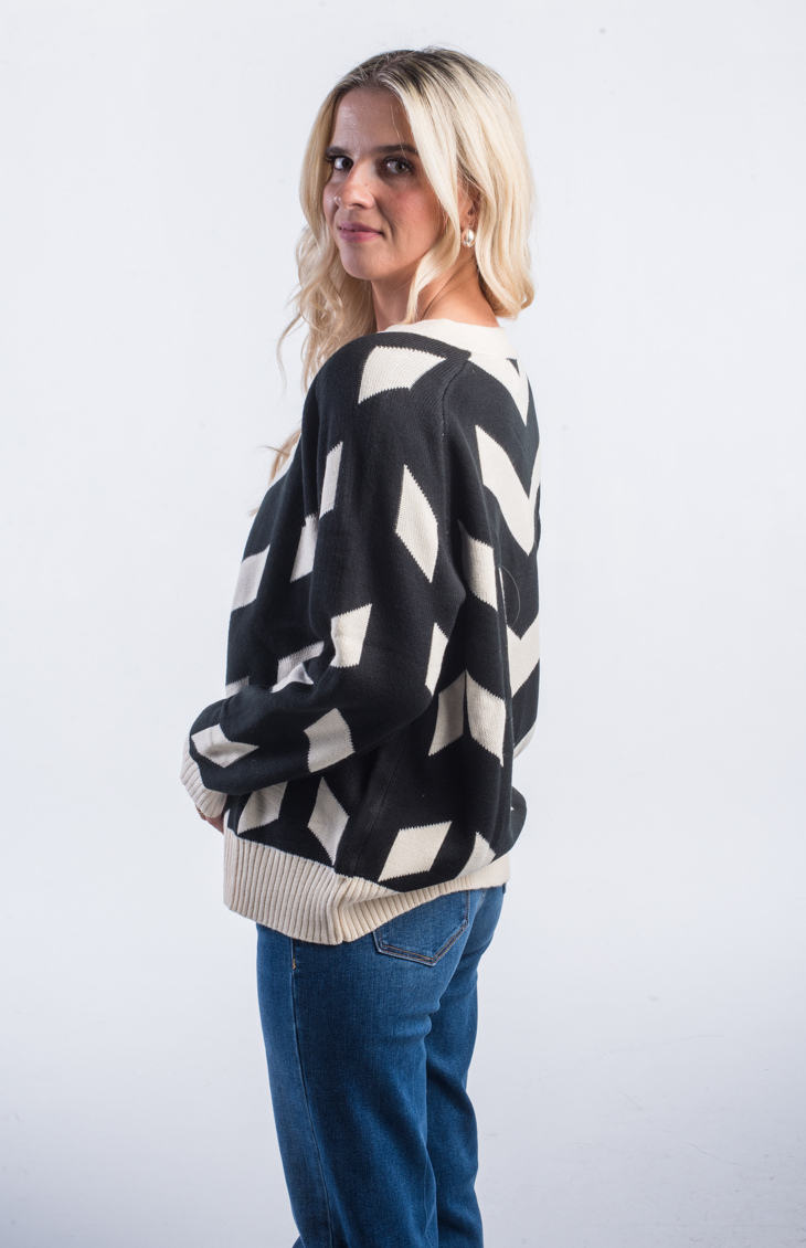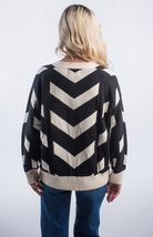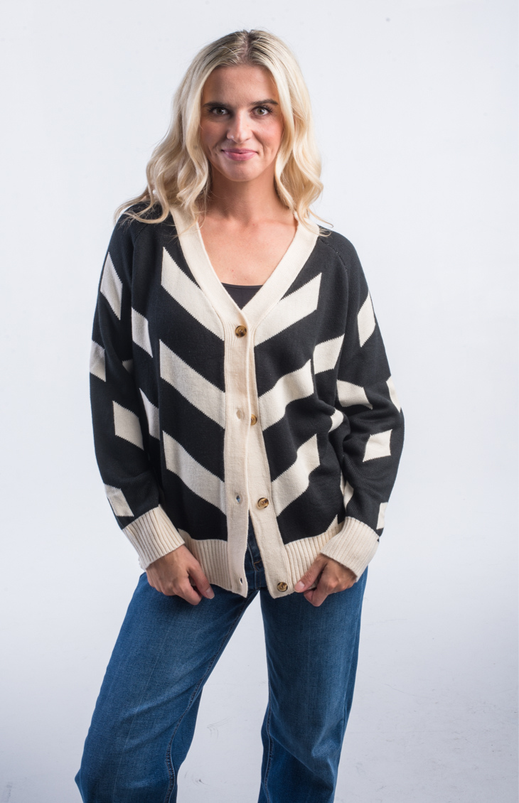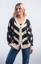 The Georgie Striped Knit Cardigan is a cozy black cardigan featuring bold cream-colored chevron stripes. It has a relaxed, slightly oversized, boxy silhouette with a button-down front closure and matching cream buttons. Ribbed cuffs and hemline add texture and a snug fit, while the lightweight design makes it perfect for layering in cooler weather. The wide V-neckline can be styled open over a top or closed for a cozy look.