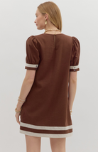 The Giselle Dress is vintage-inspired and chic with its bold, off-white stripes down the center and across bottom against the brown background. The slight puff sleeves, relaxed fit, and high neck make it sophisticated and timeless. Pair with gold accessories for an elegant and retro look all year long.