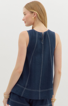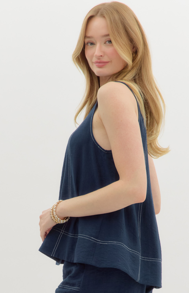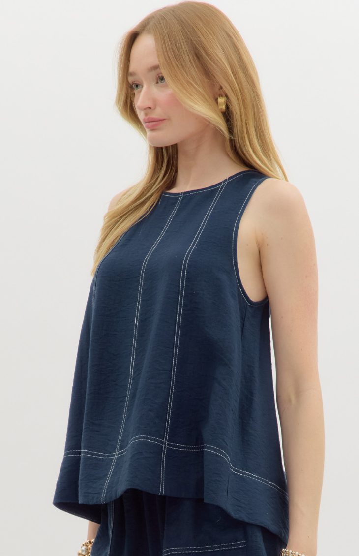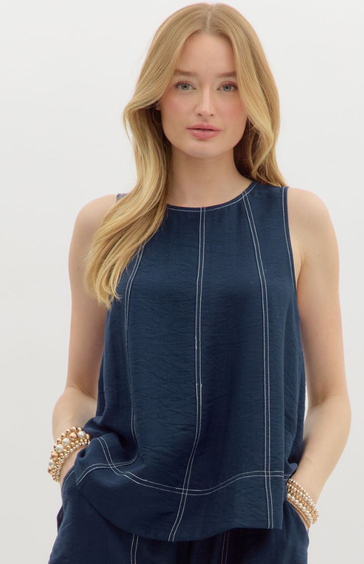 Clean lines and laid-back polish define the Irena Isles Top. Crafted in a lightweight black fabric with white contrast topstitching, this sleeveless silhouette is relaxed yet refined—perfect for pairing with tailored white shorts or linen pants.