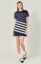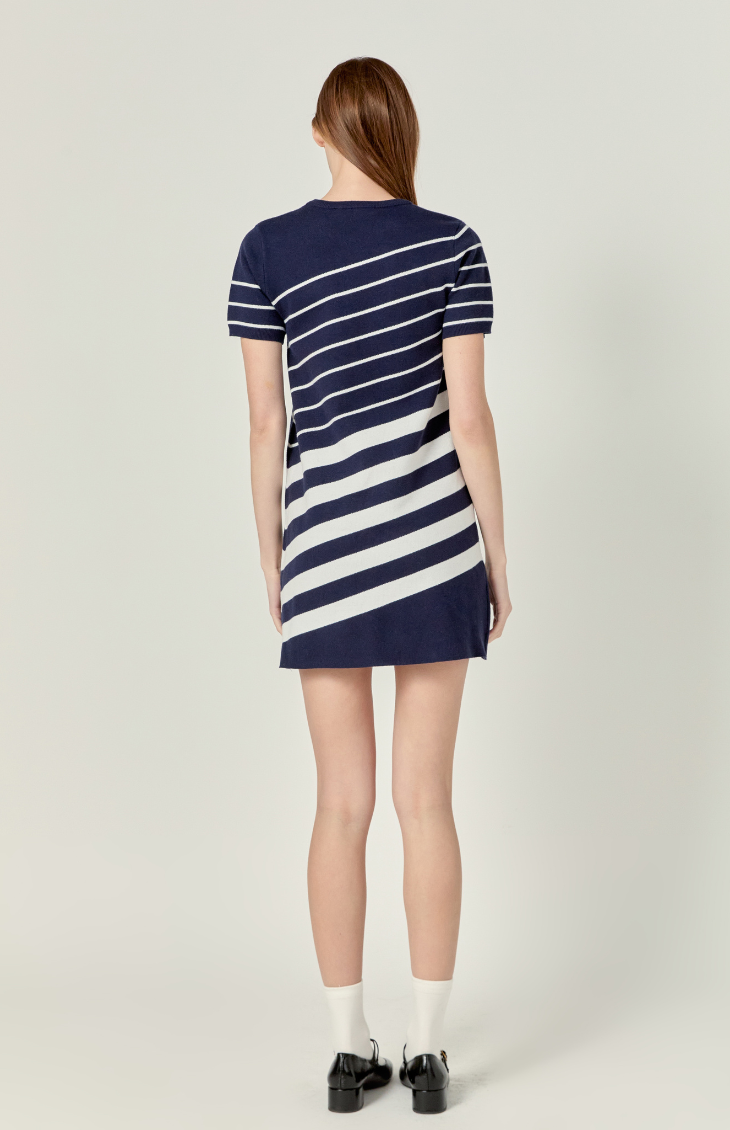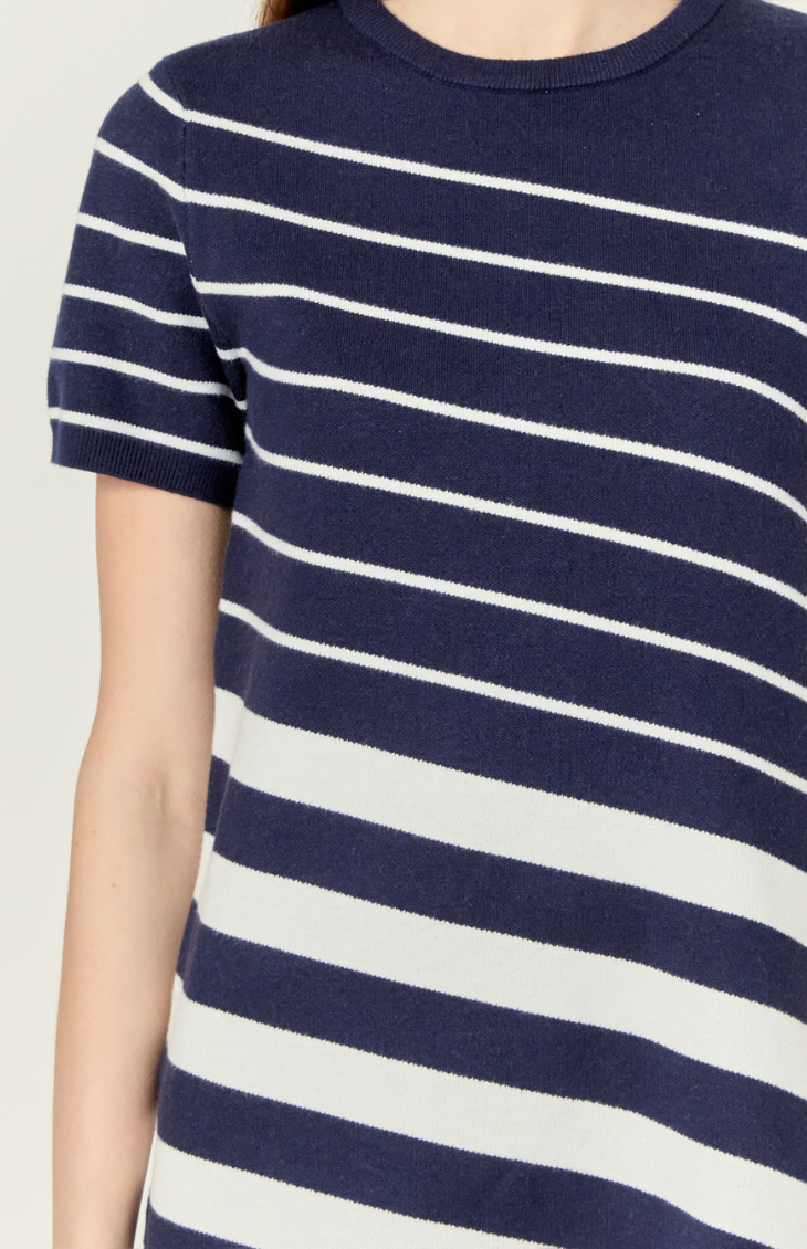 Classic meets modern with the Iris Striped Mini Dress. Featuring an asymmetrical stripe pattern, short sleeves, and a relaxed fit, this dress is both stylish and comfortable. The soft knit fabric ensures effortless wear, making it perfect for casual outings or weekend chic looks.