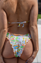 The Italian Summer Bikini Set has a white base with a European summer-inspired print on it that features illustrations of lemons and coastal landscapes, as well as pink text with names of European destinations. The orange ruffly lettuce-trim and bow detailing adds a playful touch. The top has a triangle silhouette with adjustable tie straps, and the bottoms offer stretch and cheeky coverage.