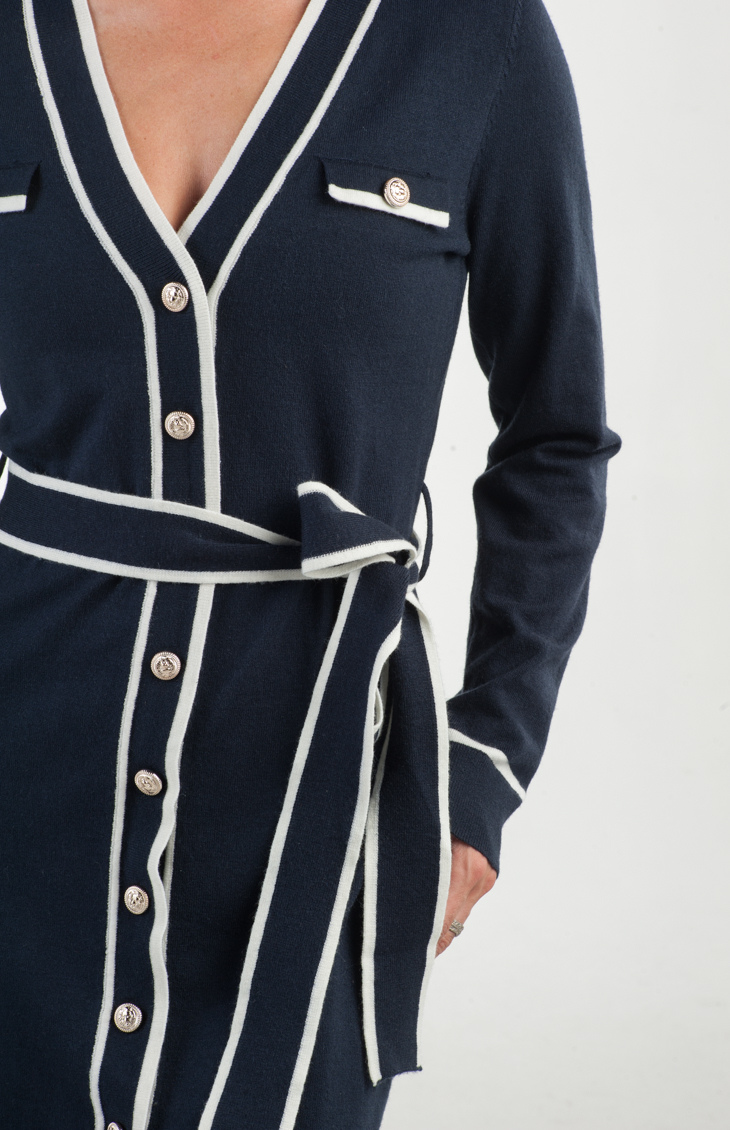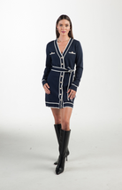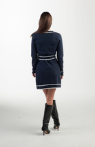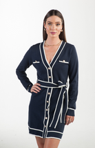 The Jayna Sweater Mini Dress in navy features white contrast piping details and a button-down front with white buttons. A V-neckline adds a chic, preppy touch, while the removable matching belt cinches the waist for a flattering silhouette. Real pocket details with button accents and long cuffed sleeves enhance the look, making this comfortable knit dress perfect for any occasion.