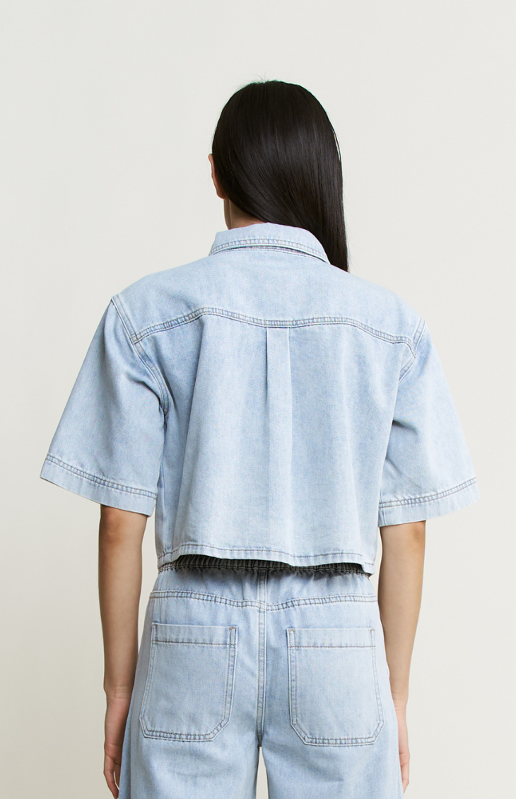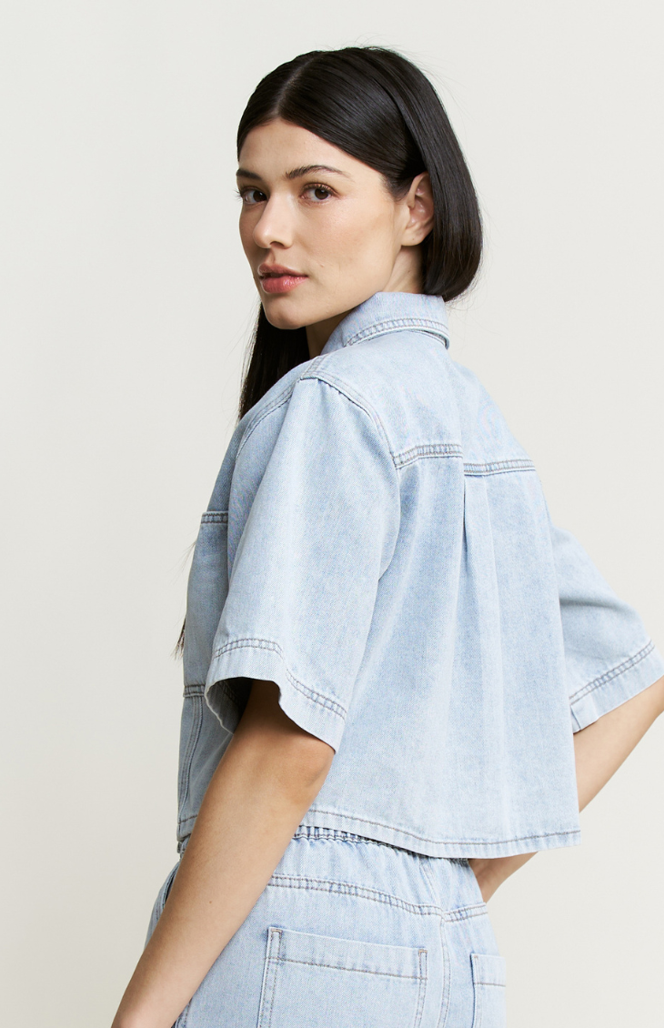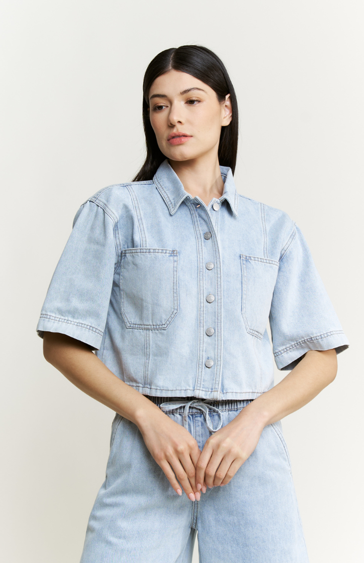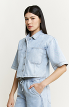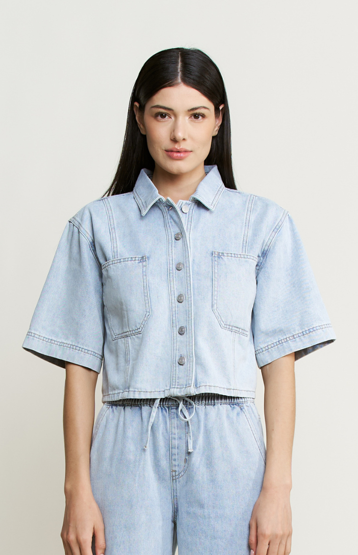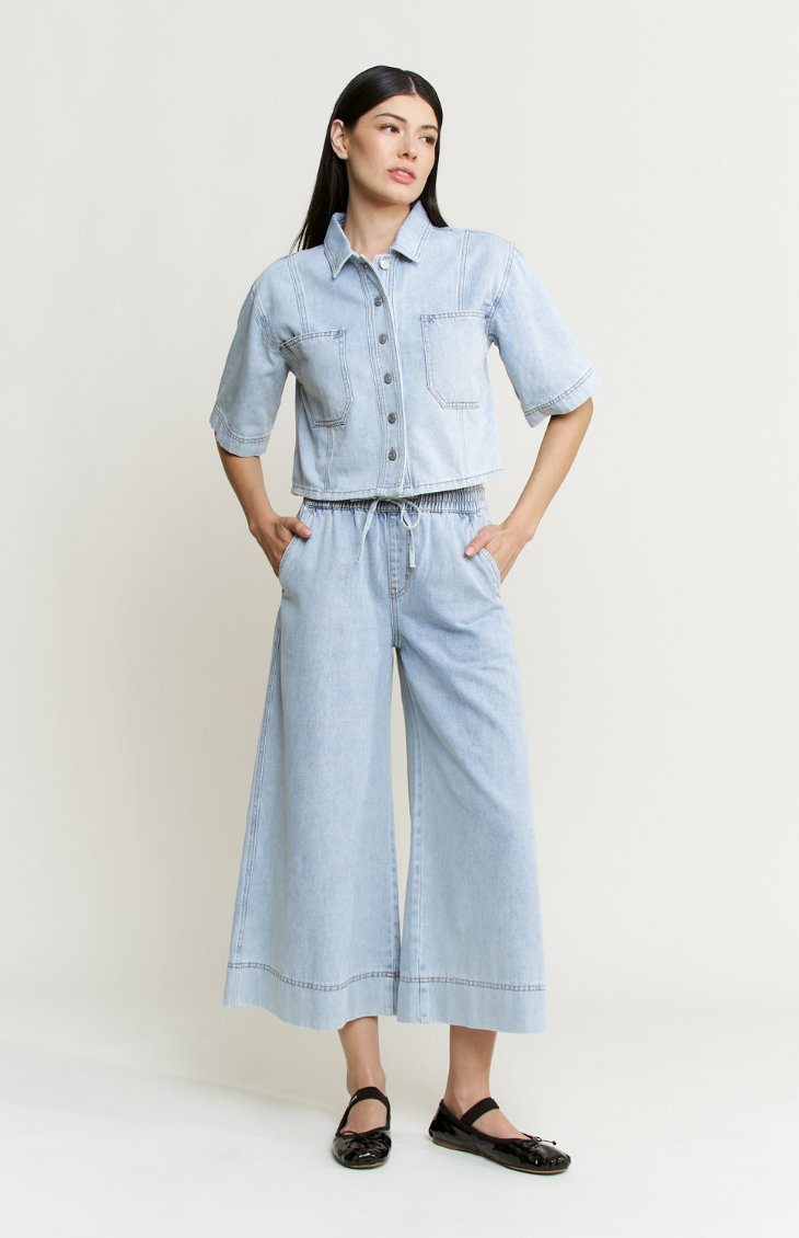 The Jules Denim Top by Mica Denim features a slightly cropped fit with 1/2 sleeves, a collar, button-down closure, and front pockets for a casual and cool look. Made with a light wash denim, its perfect to wear from spring into fall. Paired here with the Bella HR Wide Leg Capri.
