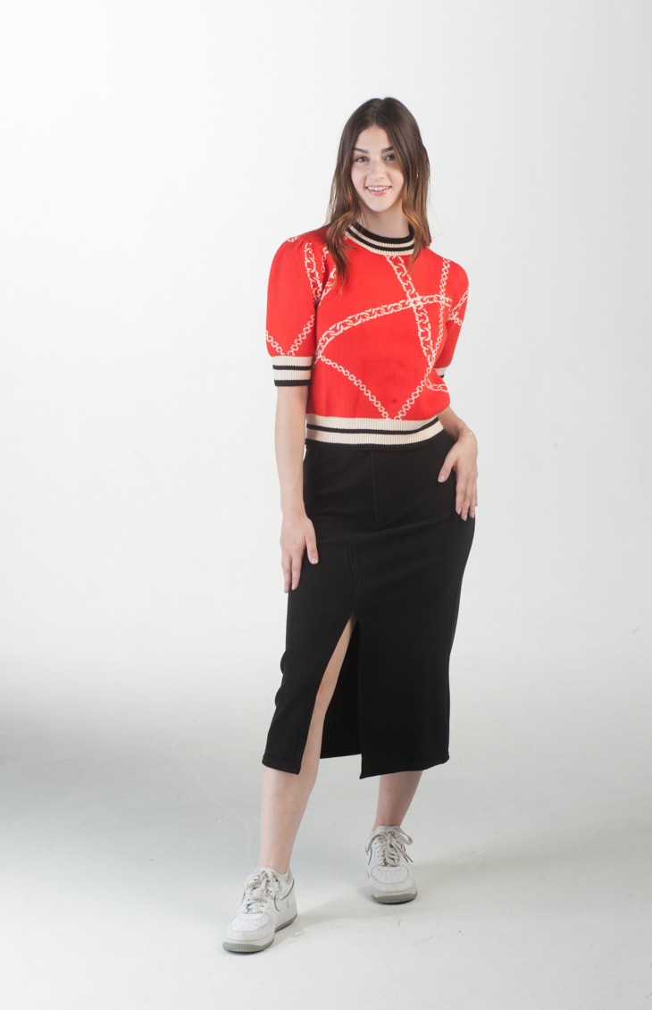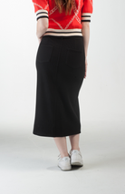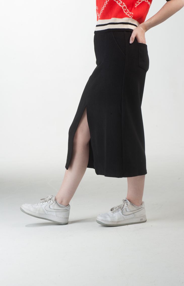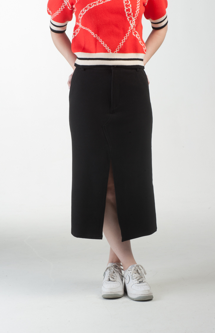 Introducing the Kimberly Midi Skirt, crafted from soft black corduroy for a sleek, stylish look. This high-waisted skirt features a classic button and zip closure, with a front slit for added style and ease of movement. The streamlined fit makes it perfect for both casual and dressed-up looks.