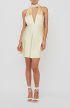 The Kortney Mini Dress is romantic and versatile featuring a halter low V-neckline and a long tie in the back that can be made into a scarf-like tie in the front or tied into a bow in the back. It exudes elegance and will be show-stopping at any formal event. It also features a wowing open back.