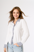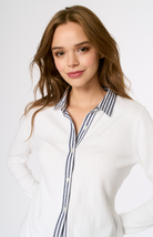 The playful and preppy Lark Button Down Sweater is a fun twist on a classic cardigan. Its knit white fabric mimics that of a timeless white cardigan. The striped-detailed collar and button down closure are reminiscent of a staple collared shit. Perfect for the office or to dress up and down during transitional seasons.