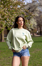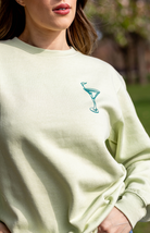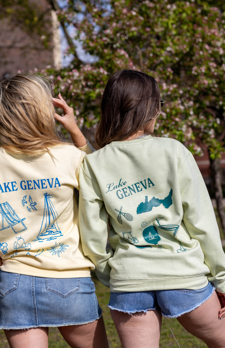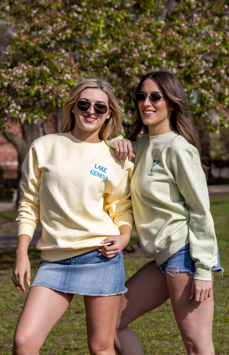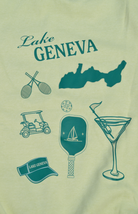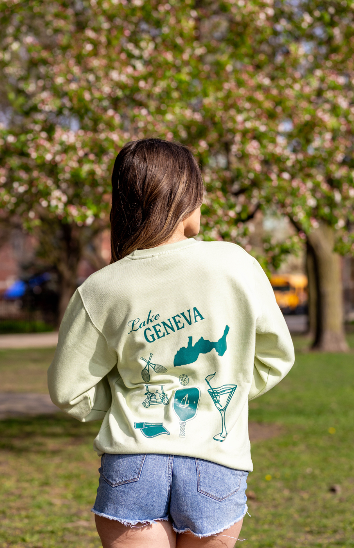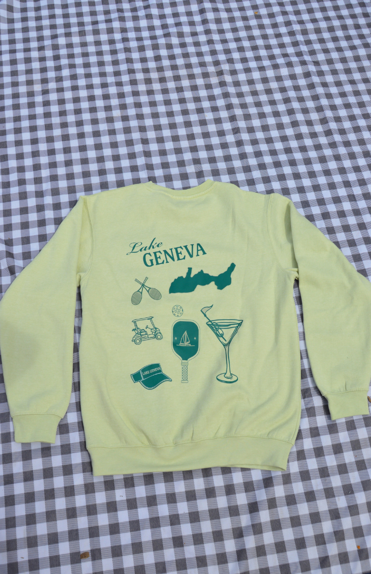 The LG Summer Fun Crewneck is a cute play on country-club. The back features "Lake Geneva" in a cursive and a serif font, an outline of Lake Geneva, a golf cart, a martini with a golf flag, a visor, a pickle ball paddle and ball, and tennis rackets in dark green. The front features a dark green martini with a golf flag. The light sweatshirt complements the dark green graphics and text, and is unisex-sized for a versatile fit.