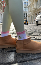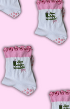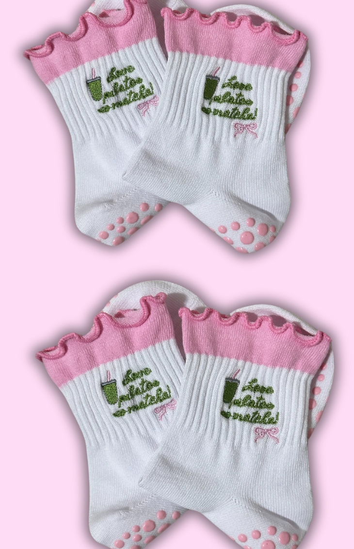 Step into your Pilates session with style in these cute and comfy socks! Featuring an embroidered green smoothie and the phrase "Love Pilates Matcha," these socks bring a playful vibe to your routine. The pink ruffled top and heart-shaped grips on the soles add extra charm and functionality, ensuring you stay balanced during your workouts. Perfect for women sizes 5-11, these socks are a fun addition to any activewear collection!