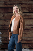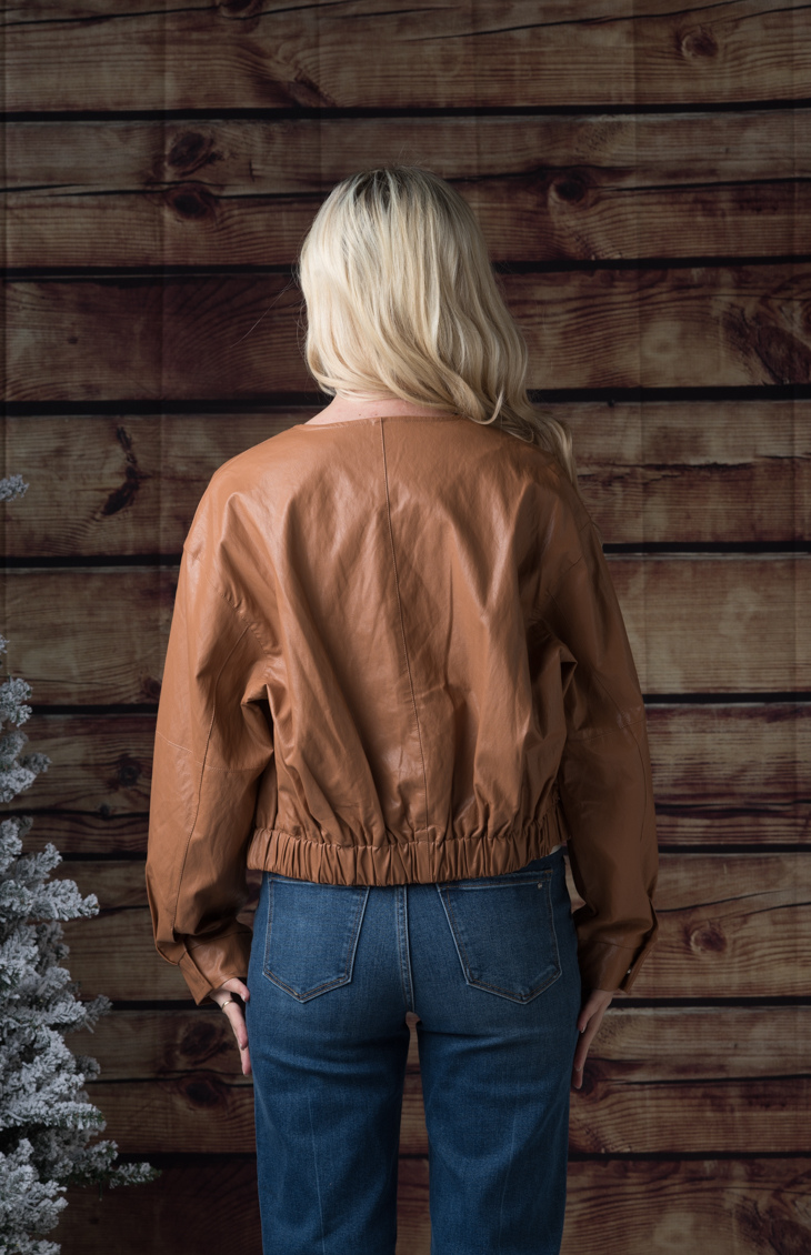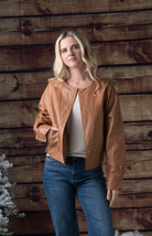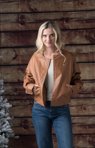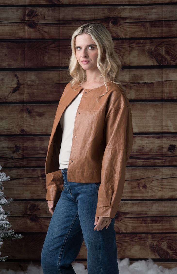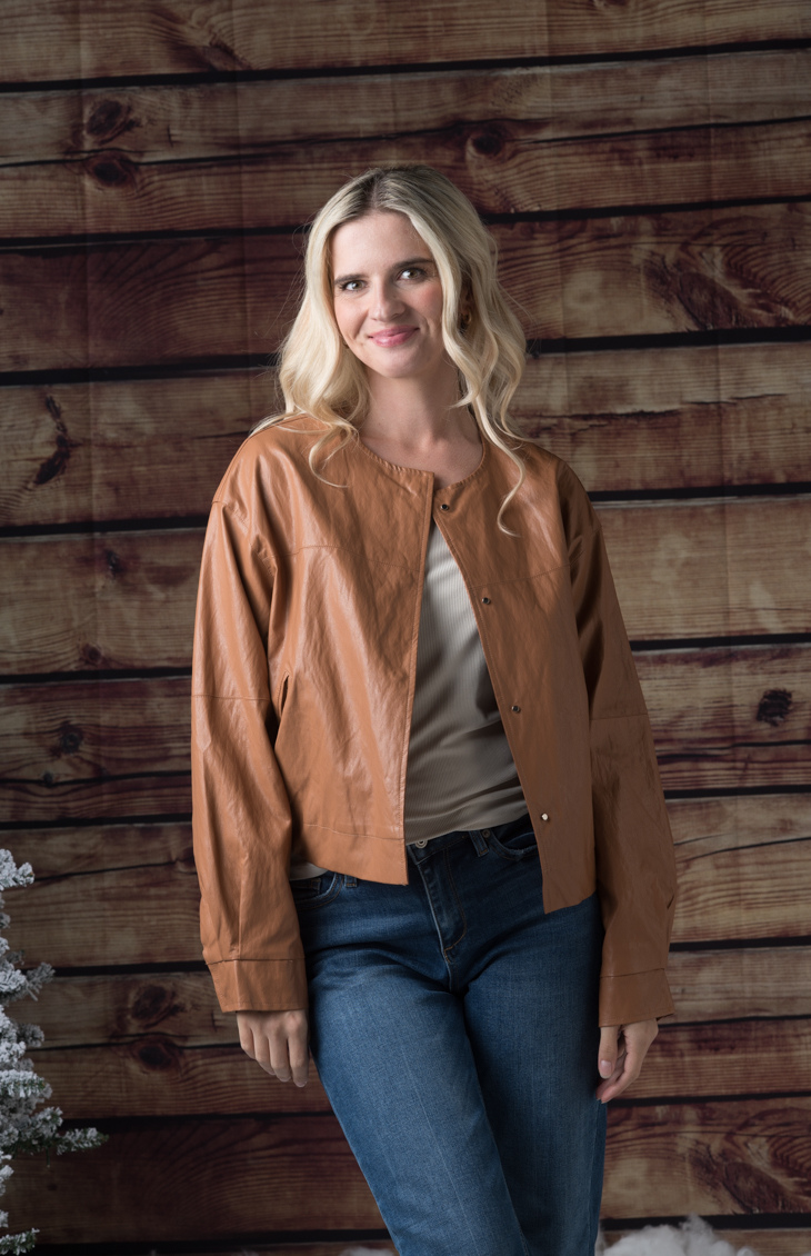 The Melinda Vintage Vegan Leather Jacket is a stylish tan piece that adds modern sophistication to any outfit. Featuring a classic button-down front, this jacket offers a sleek look that’s perfect for layering over casual outfits or dressing up for an evening out. Its versatile design ensures you’ll reach for this jacket time and again.