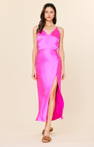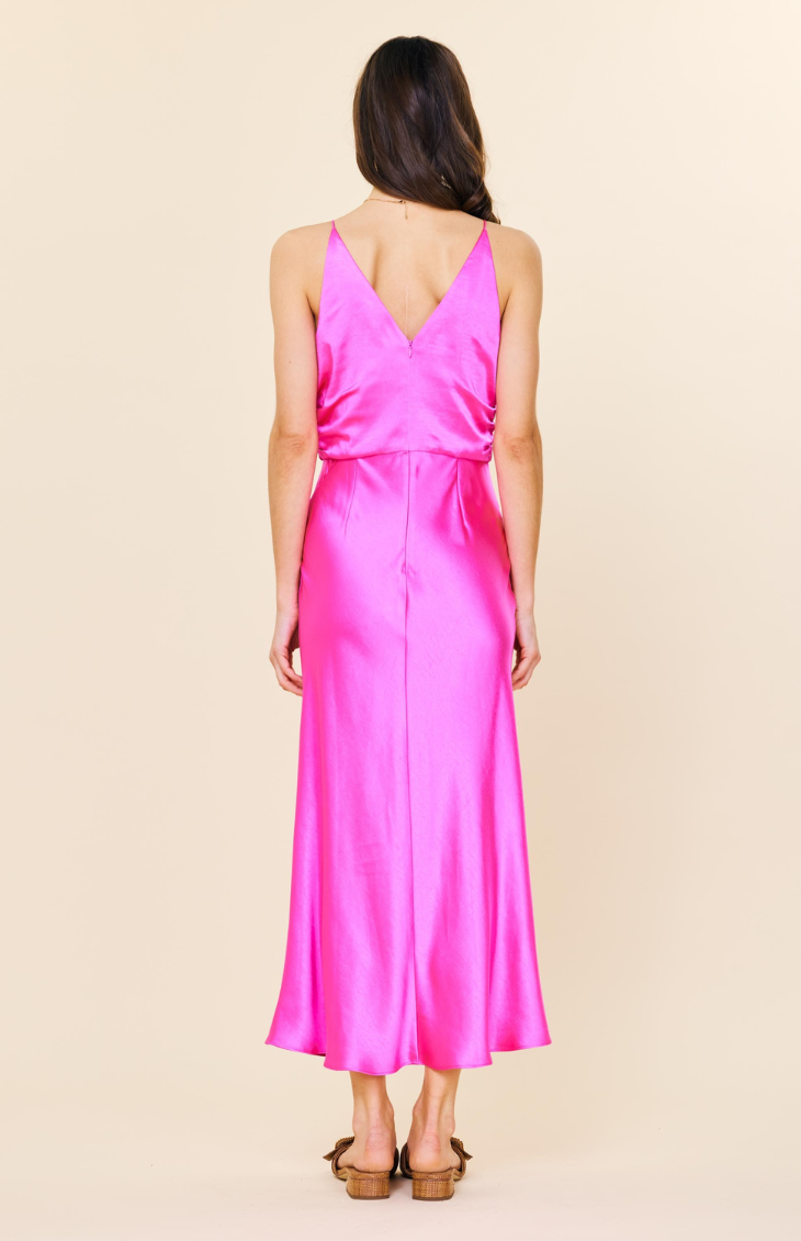 Turn heads in the Naomi Satin Midi Dress. Featuring a v-neckline, cinching at the sides, and the perfect side slit, this dress will allow you to stand out at your next special occasion.