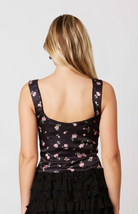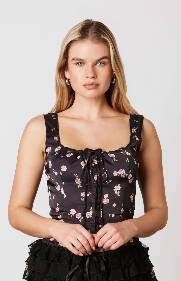 The Narvani Top is a floral corset-inspired tank featuring a button-down center and ruched tie detail around the neckline giving it a vintage coquette look. Its lining and two slits along the bottom give it a flattering silhouette, making it the perfect going out top that can be worn all year round.