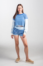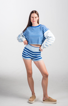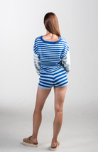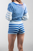 The Omar Shorts feature a color block design with horizontal stripes in blue, matching the Omar Sweater for a cohesive look. The high-waisted fit offers a flattering silhouette, while the soft, stretchy knit fabric ensures comfort. An elastic waistband provides a secure fit, making them perfect for lounging or as a beach cover-up.