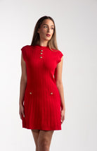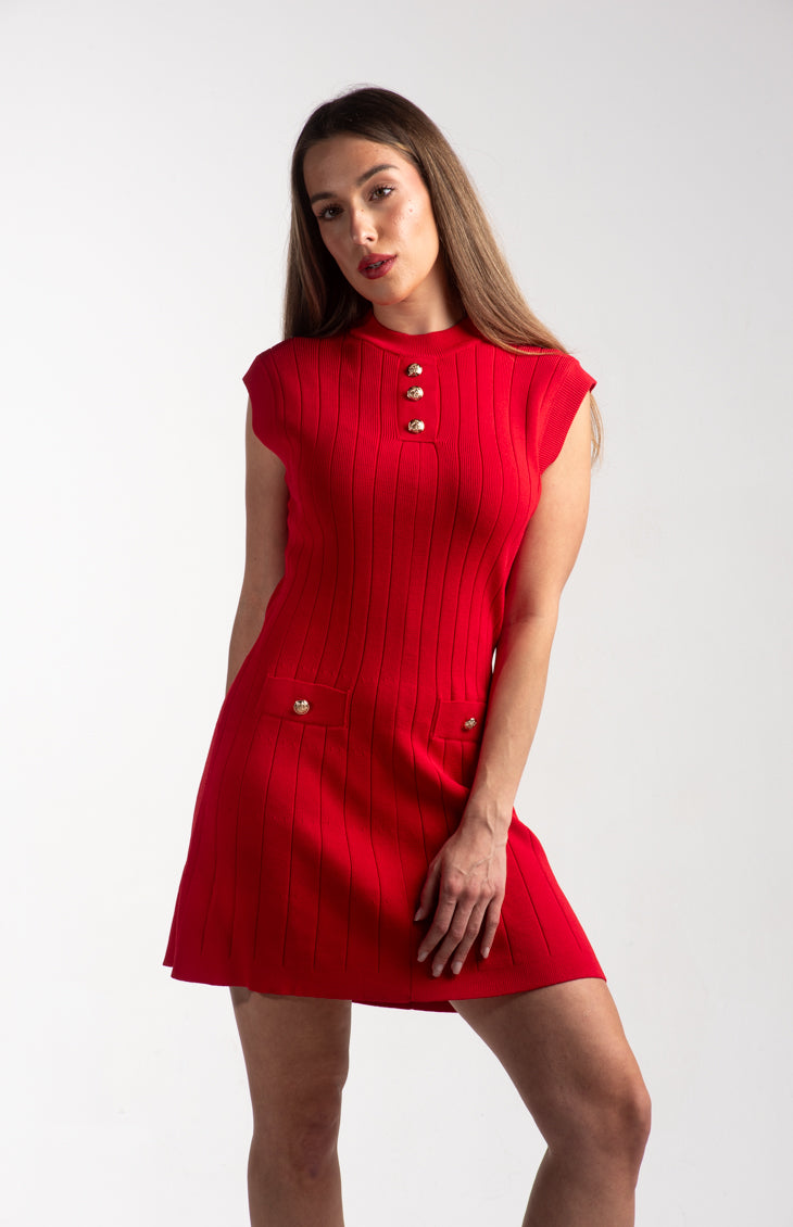 This knit mini dress is indeed radiantly chic. Featuring ribbed texture for a flattering fit, it’s adorned with gold-tone buttons at the neckline and stylish front pockets. Perfect for both casual and polished looks for day or night, this dress combines elegance with effortless style.