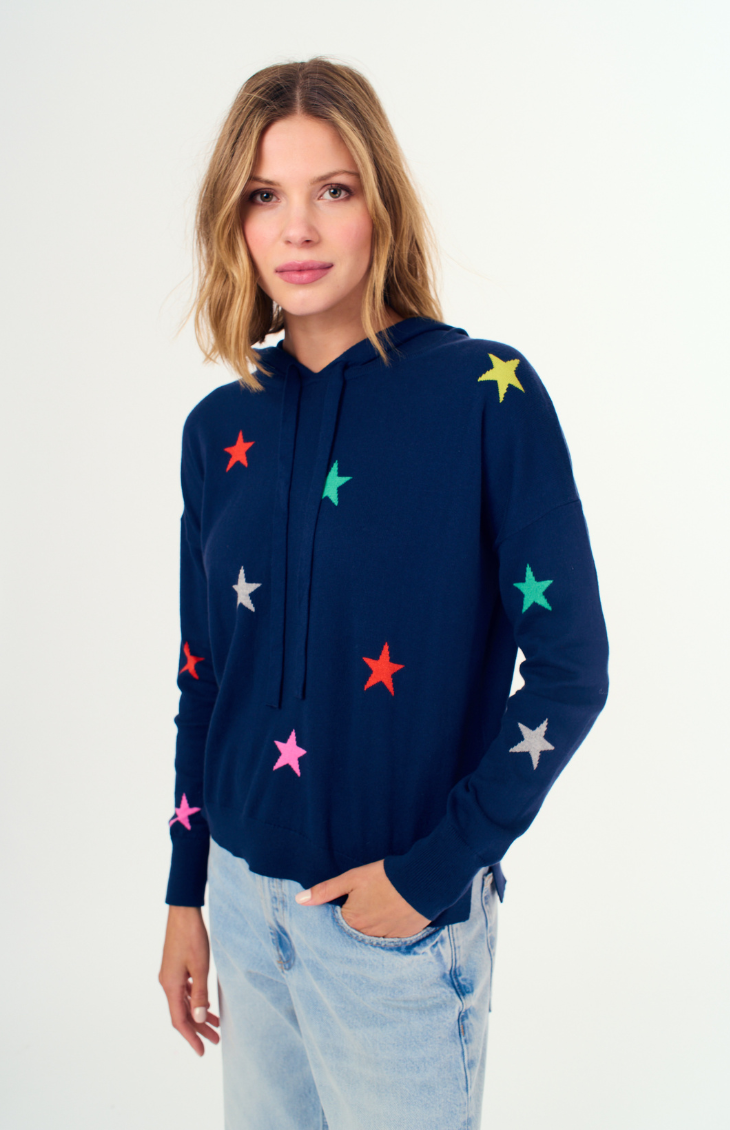 Brighten up your cozy days with the Rae Star Hoodie. This navy pullover features bold, colorful stars and an easy drawstring hood, perfect for adding playful energy to your casual wardrobe. Pair it with jeans or leggings for an effortlessly fun look.