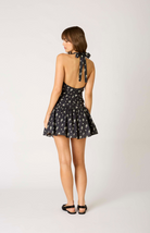 The Ravinna Shores Mini Dress blends vintage charm with playful elegance. Featuring a sweetheart neckline with ruched detailing and an open back with a bow-tied halter, this dress flatters the figure while keeping things flirty. A fitted bodice flows into a softly pleated skirt, adorned with a delicate floral print that stands out against its deep black background. It's the perfect choice for sunny afternoons or evening strolls.