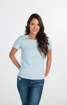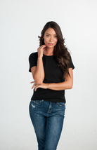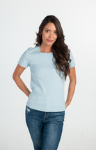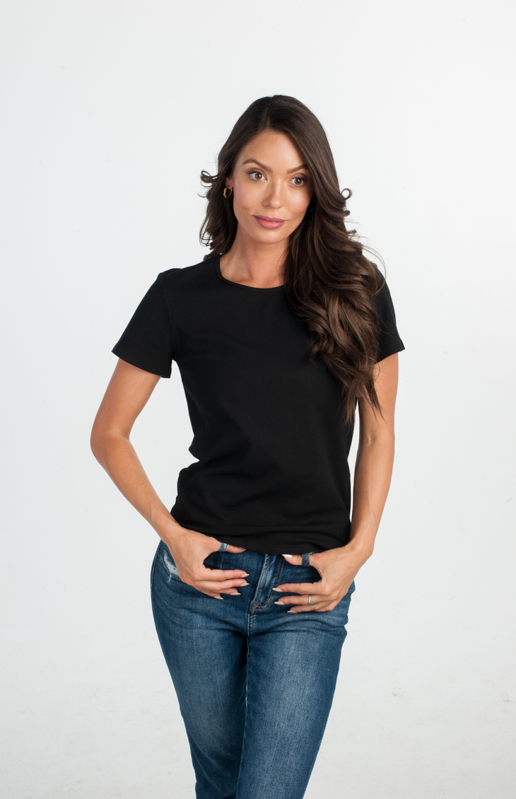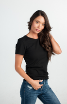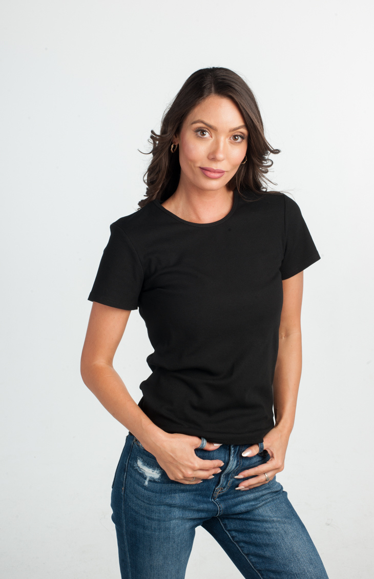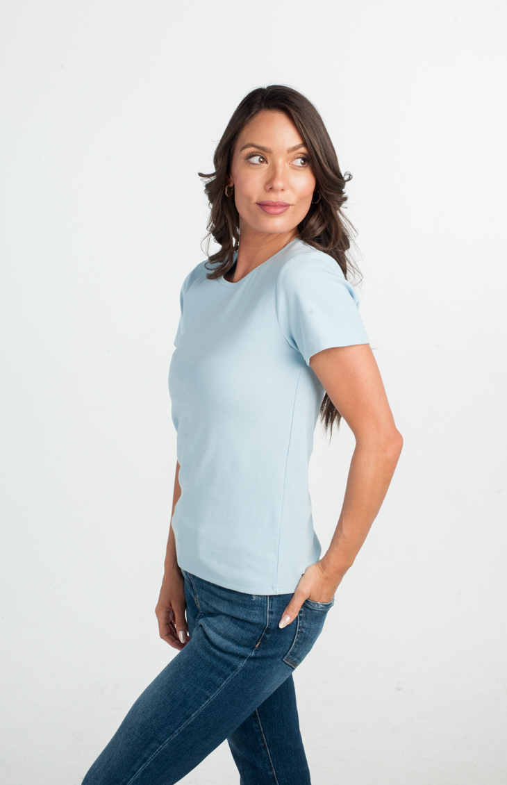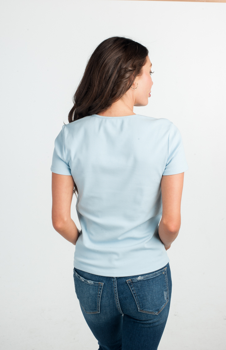 Meet your new favorite basic, the Reese Basic Tee! Available in light blue and black, this ribbed tee is perfect for any casual day. Soft and comfy, it's great for layering or wearing on its own. Stay stylish and comfortable with this versatile tee.