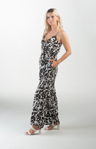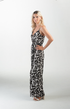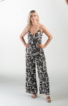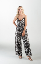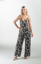 Introducing the Risa Jumpsuit, featuring a striking black and white floral print. This sleeveless jumpsuit comes with spaghetti straps and a V-neckline with a wrap-style front. A matching fabric belt cinches the waist for a flattering fit, while the wide-leg design adds a flowy silhouette. Side pockets provide added convenience, making this jumpsuit both stylish and functional.