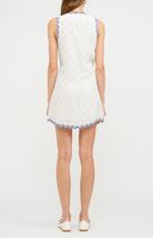The Robin Mini Dress is a delicate piece with a soft, feminine aesthetic. The dress features a light cream base with a subtle all-over bow print in pale blue. It has a flattering V-neckline and sleeveless cut, trimmed with wavy, scalloped blue edging along the neckline and hem, adding a sweet vintage-inspired detail. The gathered bust enhances the shape, while the breezy silhouette keeps it effortlessly chic.