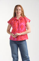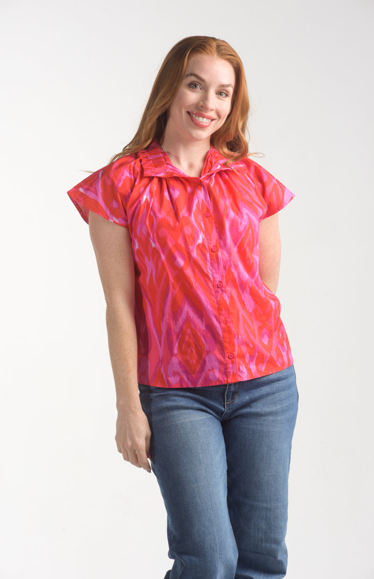 Exude energy and style in this bold pink and red printed blouse. Designed with a gathered ruffle neckline and delicate button-up front, this lightweight top offers a chic yet effortless look. Perfect for pairing with jeans or shorts, it adds a striking pop of color to any wardrobe.