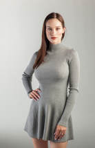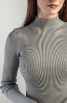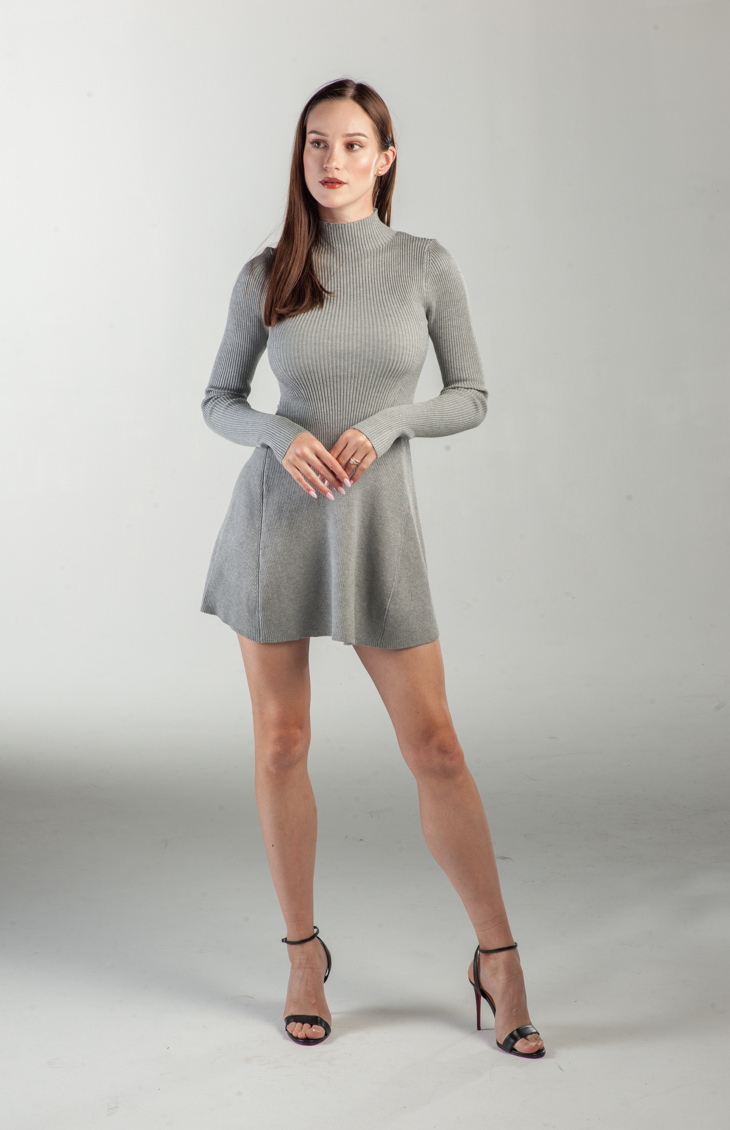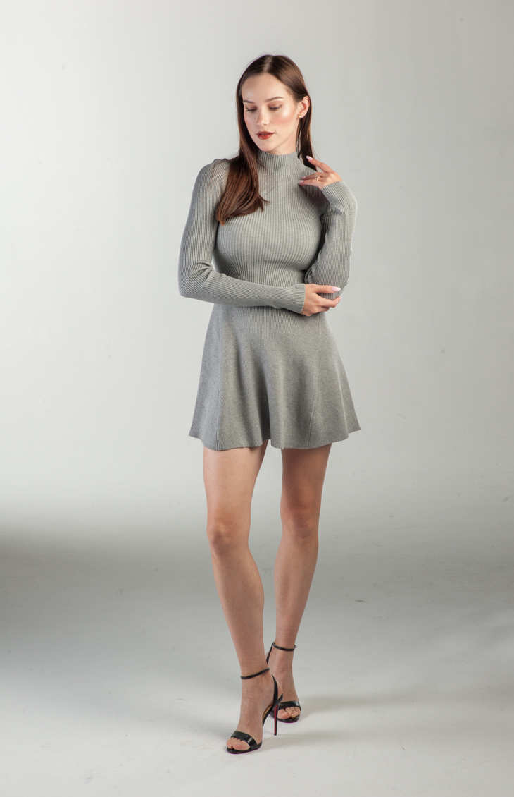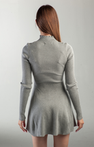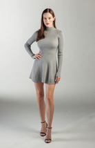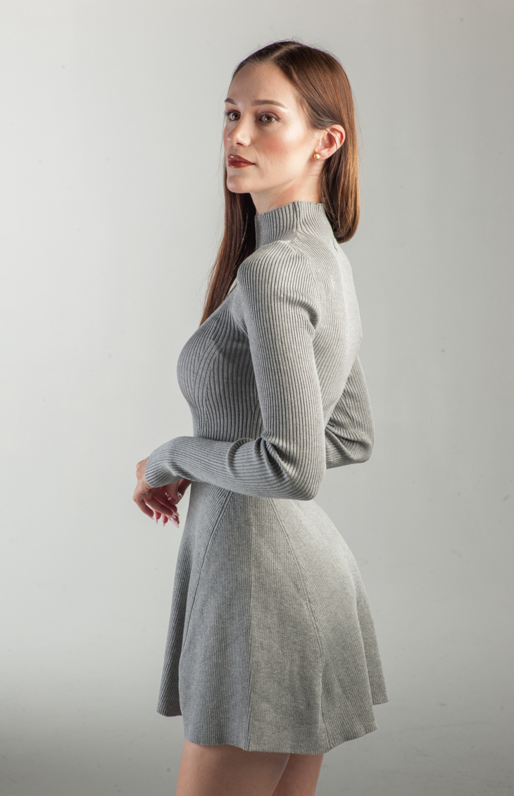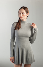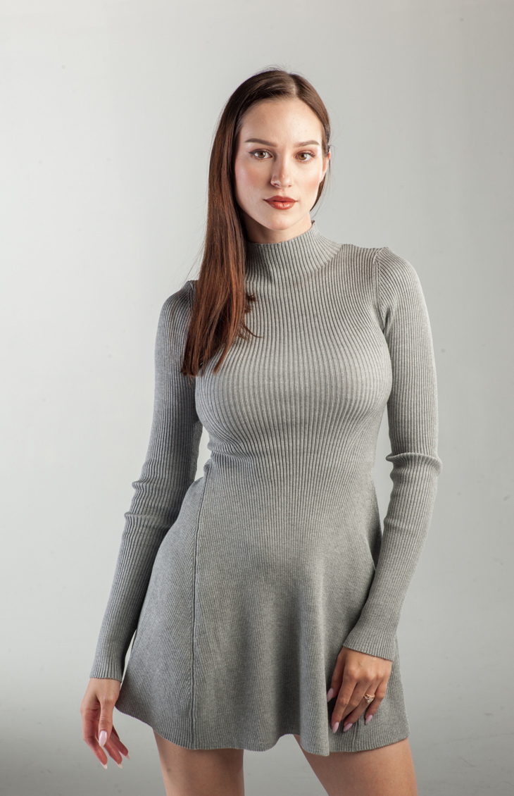 The Santa Rosa Sweater Dress features a fitted ribbed knit material for a figure-hugging silhouette. Its mock turtleneck collar adds a classic touch, while long sleeves provide warmth. The flared A-line skirt creates a flattering shape, and the comfortable, stretchy fabric allows for easy movement. In a subtle grey color, this dress is perfect for versatile styling, ideal for casual wear or dressing up for formal occasions, making it suitable for fall and winter.