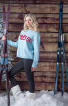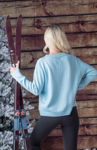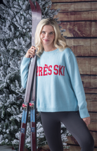 The Ski Season Sweater is a light blue piece that features bold red lettering reading "apres ski." This cozy sweater is perfect for showcasing your love for winter sports while keeping you warm and stylish. Its relaxed fit makes it ideal for layering or wearing on its own, making it a must-have for your winter wardrobe.